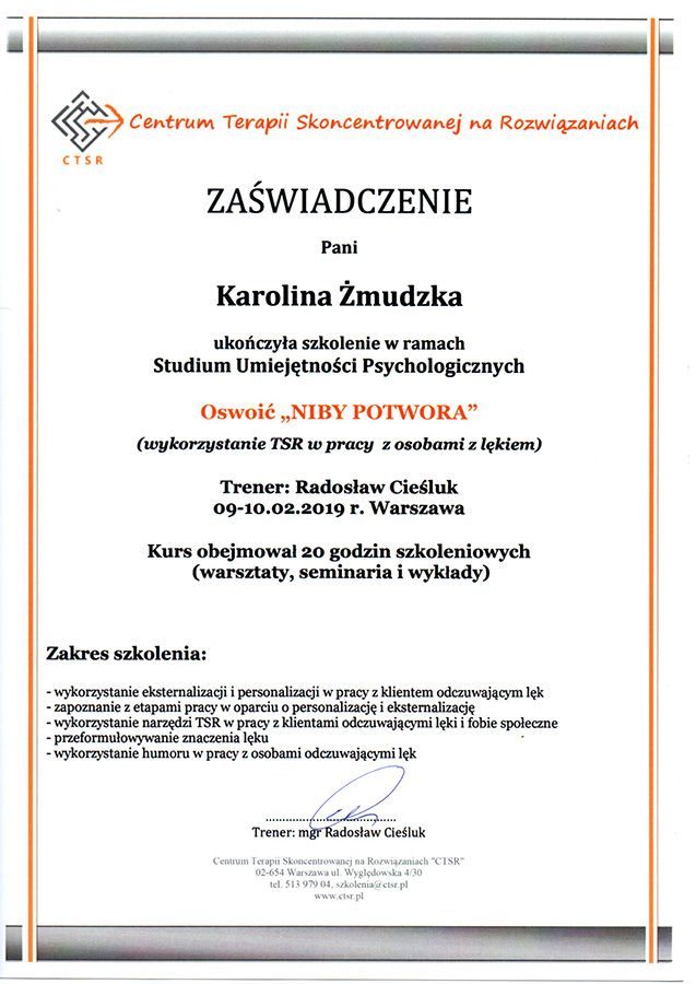 Jestem bardzo zadowolona z pracy z Panią Karoliną. Dzięki niej znalazłam w sobie odwagę i uwierzyłam że mogę być sama sobie sterem, okrętem i rzeglarzem. Każde spotkanie powodowało, że zaczynałam bardziej wierzyć w siebie i to że mogę wiele. Zrozumiałam dzięki niej że jedynym moim problemem jest strach i każde spotkanie powodowało że coraz mniej było go we mnie. Mogę śmiało polecić Panią Karolinę .