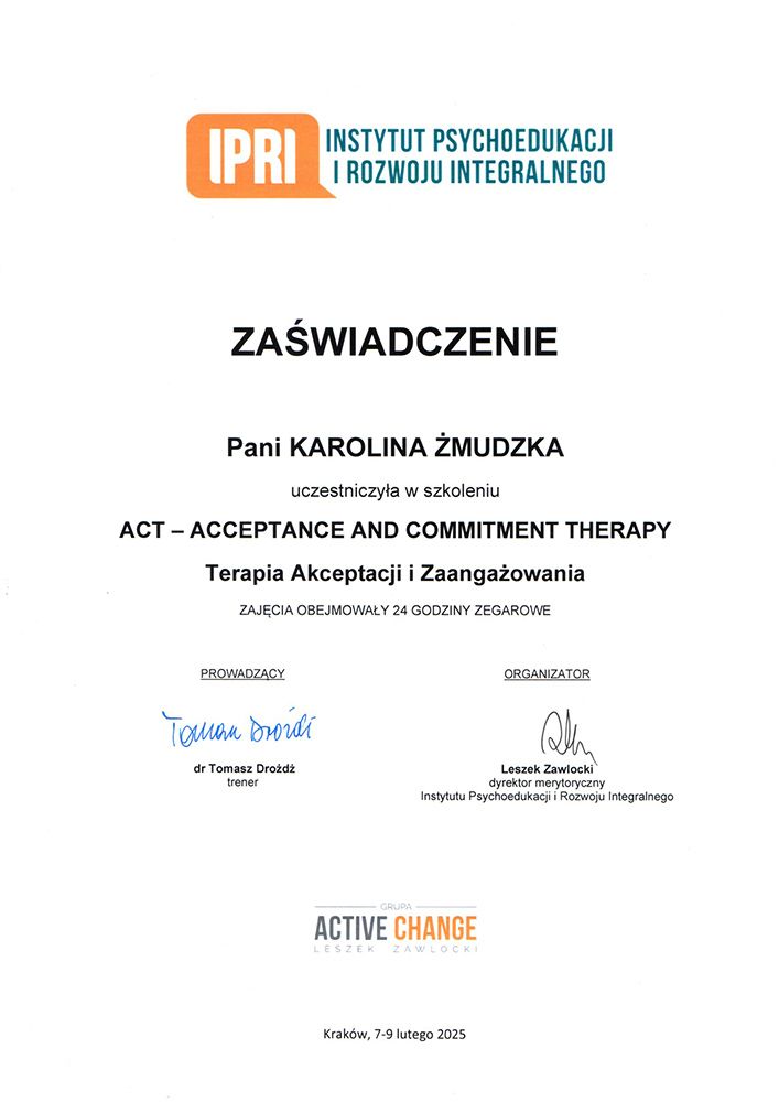 Chciałbym podzielić się pozytywną opinią o coachingu kariery z Karoliną Żmudzką. Zgłosiłem się, gdy czułem stagnację, niepewność i wypalenie zawodowe. Wspólnie określiliśmy moje wartości, mocne strony i aspiracje, a także konkretne cele z realnym terminem realizacji. Dzięki trafnym pytaniom i ćwiczeniom zrozumiałem, co naprawdę mnie motywuje i jak połączyć swoje wartości z pracą. Coaching pomógł mi przełamać obawy i zacząć działać – zdobywać nowe kwalifikacje, rozwijać umiejętności i budować sieć kontaktów. Już w trakcie procesu znalazłem nowy kierunek zawodowy i zacząłem realizować pierwsze cele. Dziś mam jasną wizję przyszłości i większą pewność siebie. Karolina łączy empatię i uważne słuchanie z praktycznymi wskazówkami i biznesowym podejściem. Dzięki jej wsparciu w ciągu czterech miesięcy zrobiłem ogromny krok naprzód zawodowo i mentalnie. Z pełnym przekonaniem polecam współpracę z Karoliną.