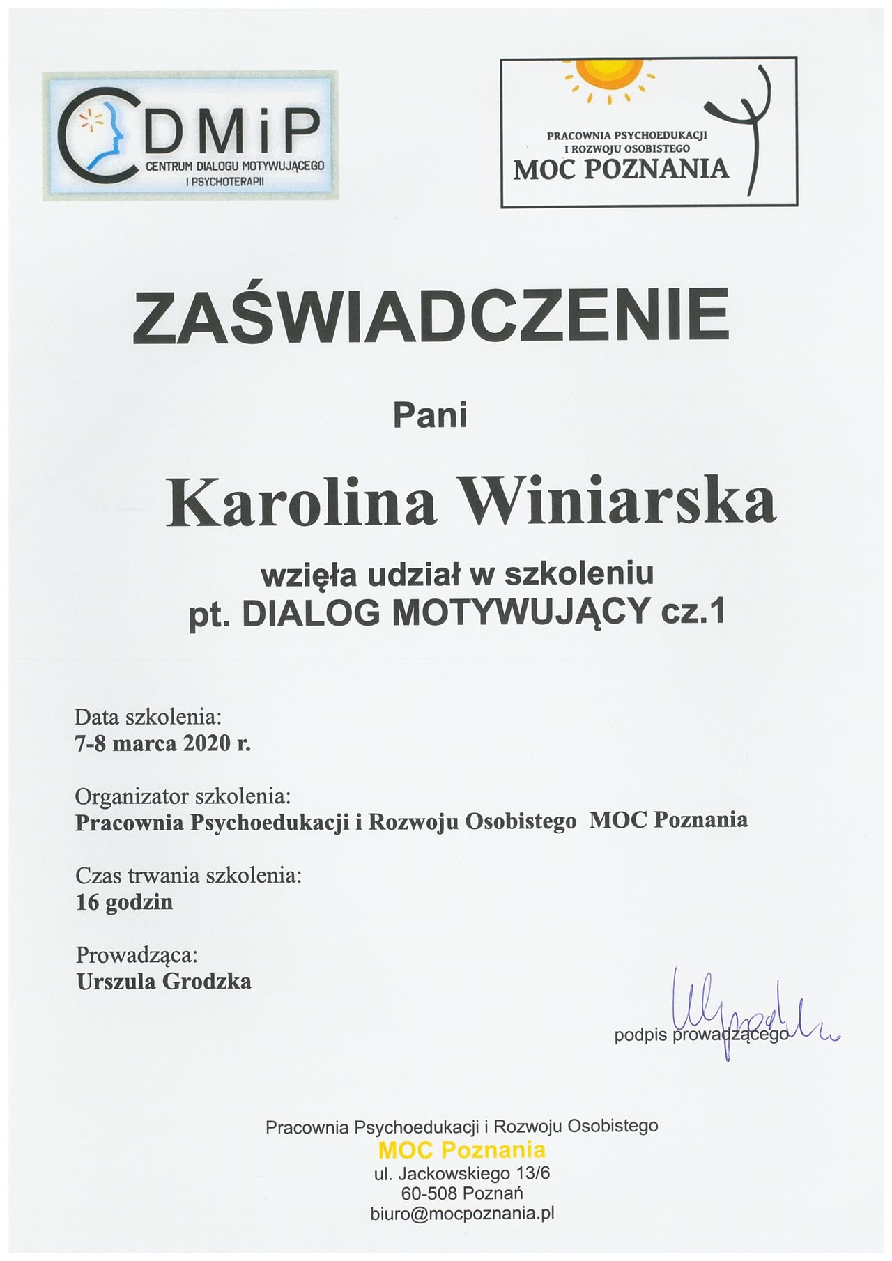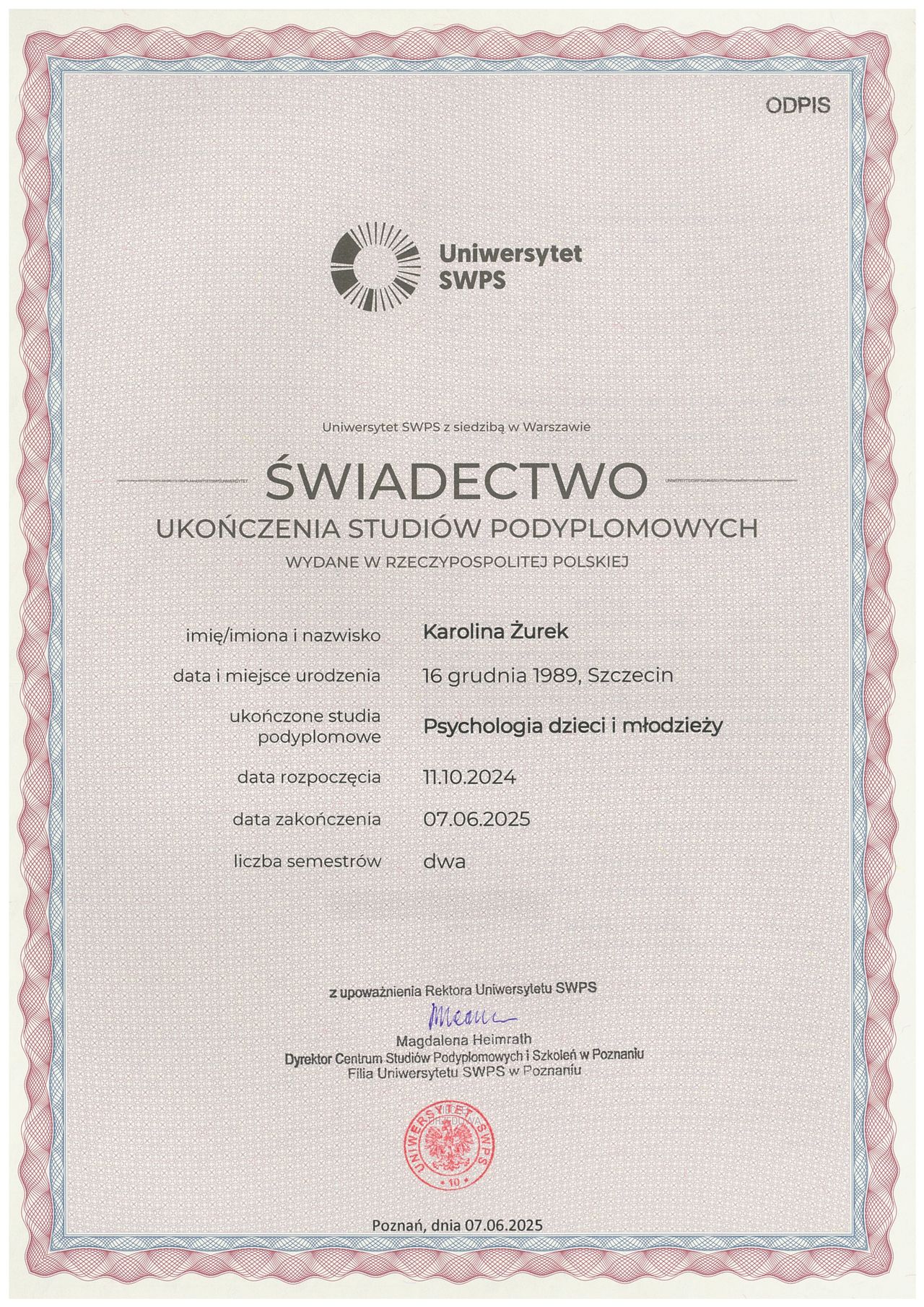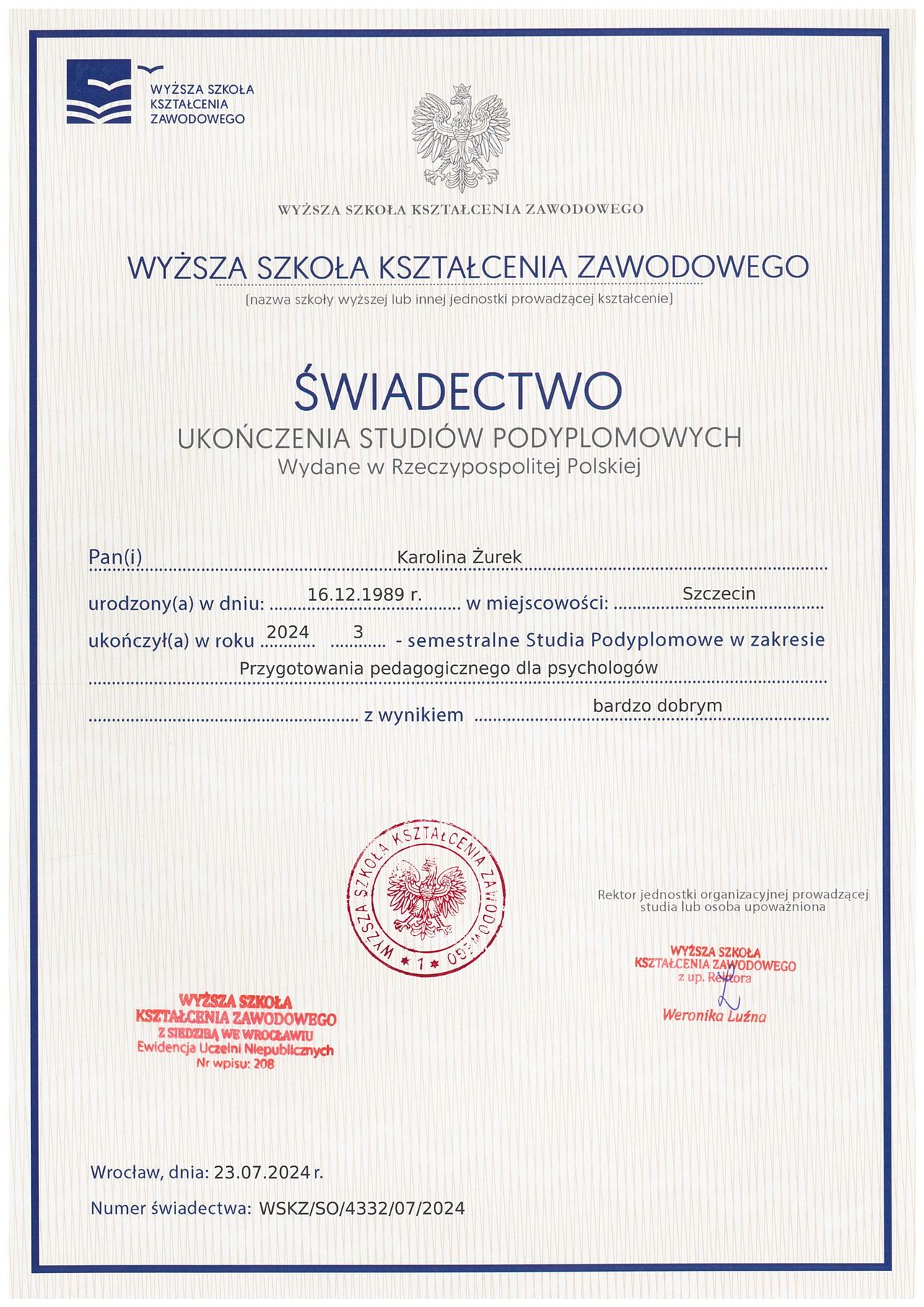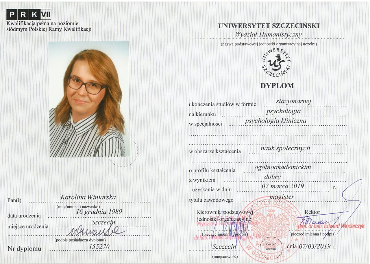 Psycholog o spec. klinicznej, psycholog dzieci i młodzieży, asystent osoby z autyzmem oraz osoby z niepełnosprawnością, trener TUS, terapeuta metody Kids' Skills, terapeuta dialogu motywującego, psychoterapeuta systemowy w trakcie szkolenia w Wielkopolskim Towarzystwie Terapii Systemowej.