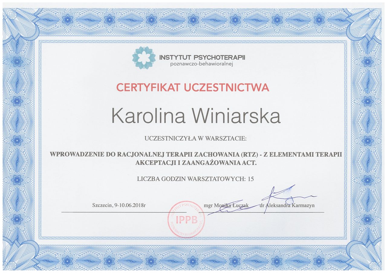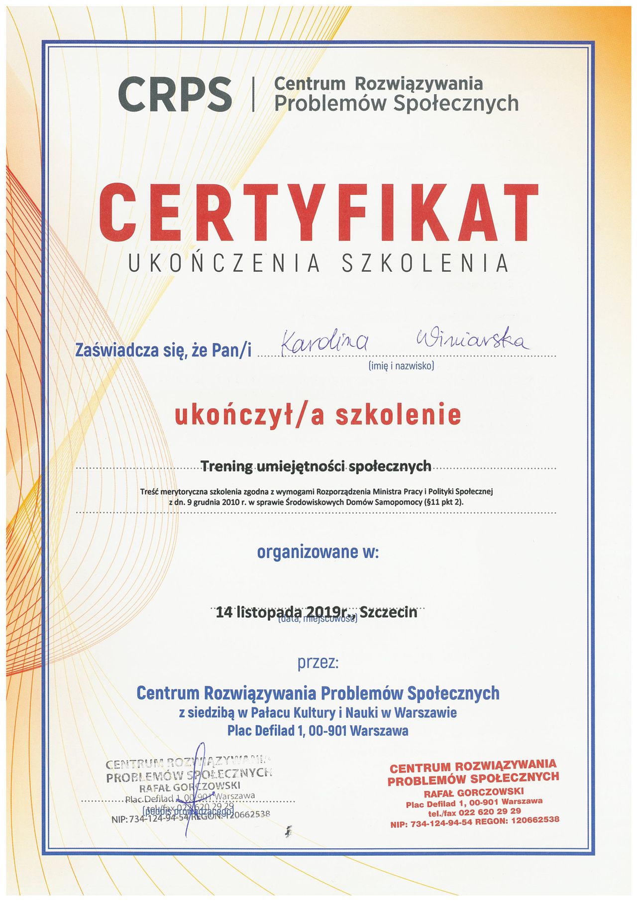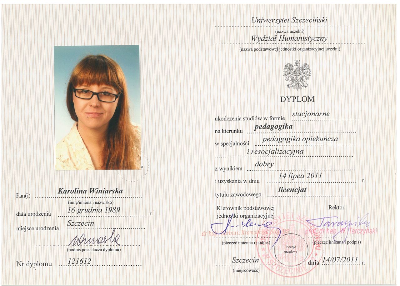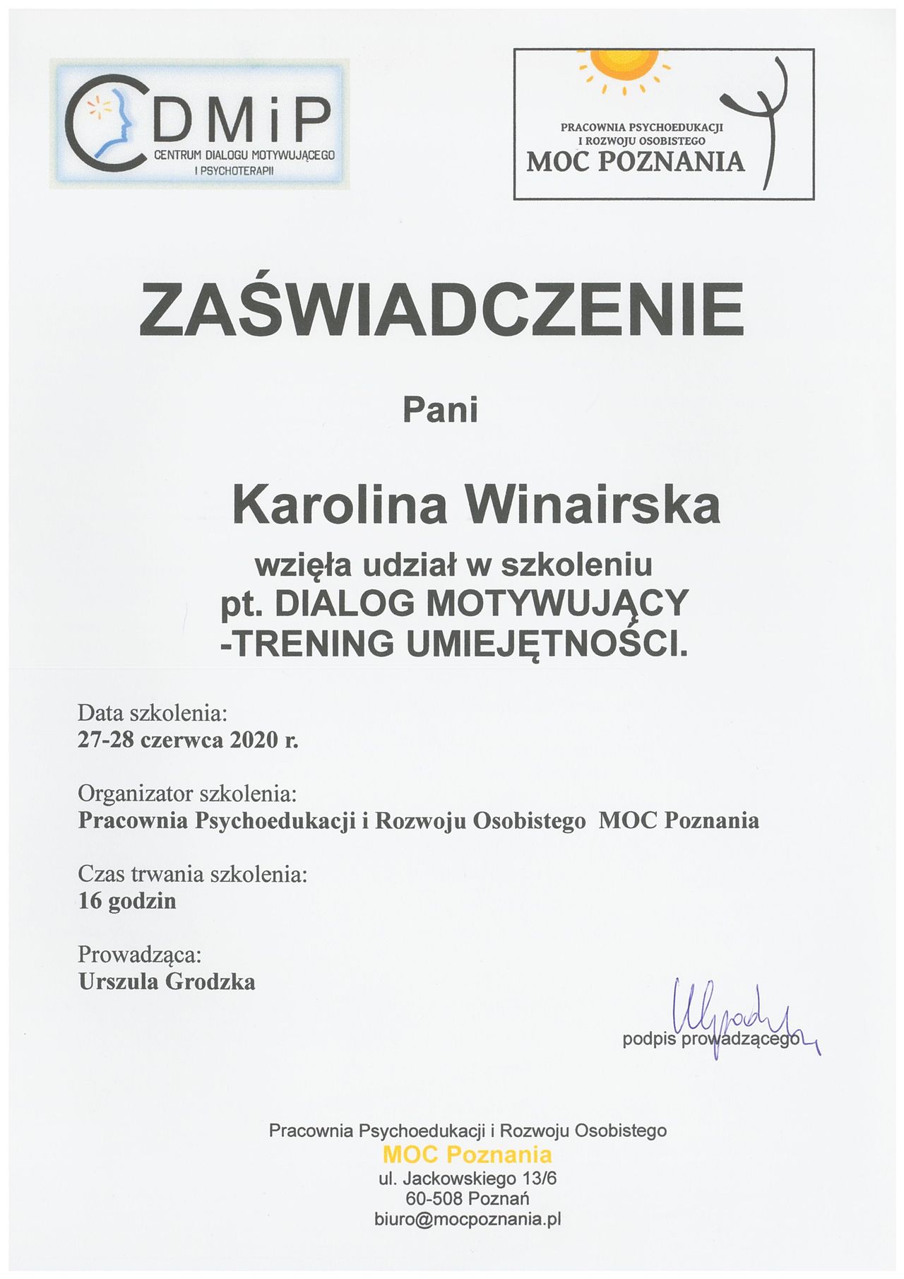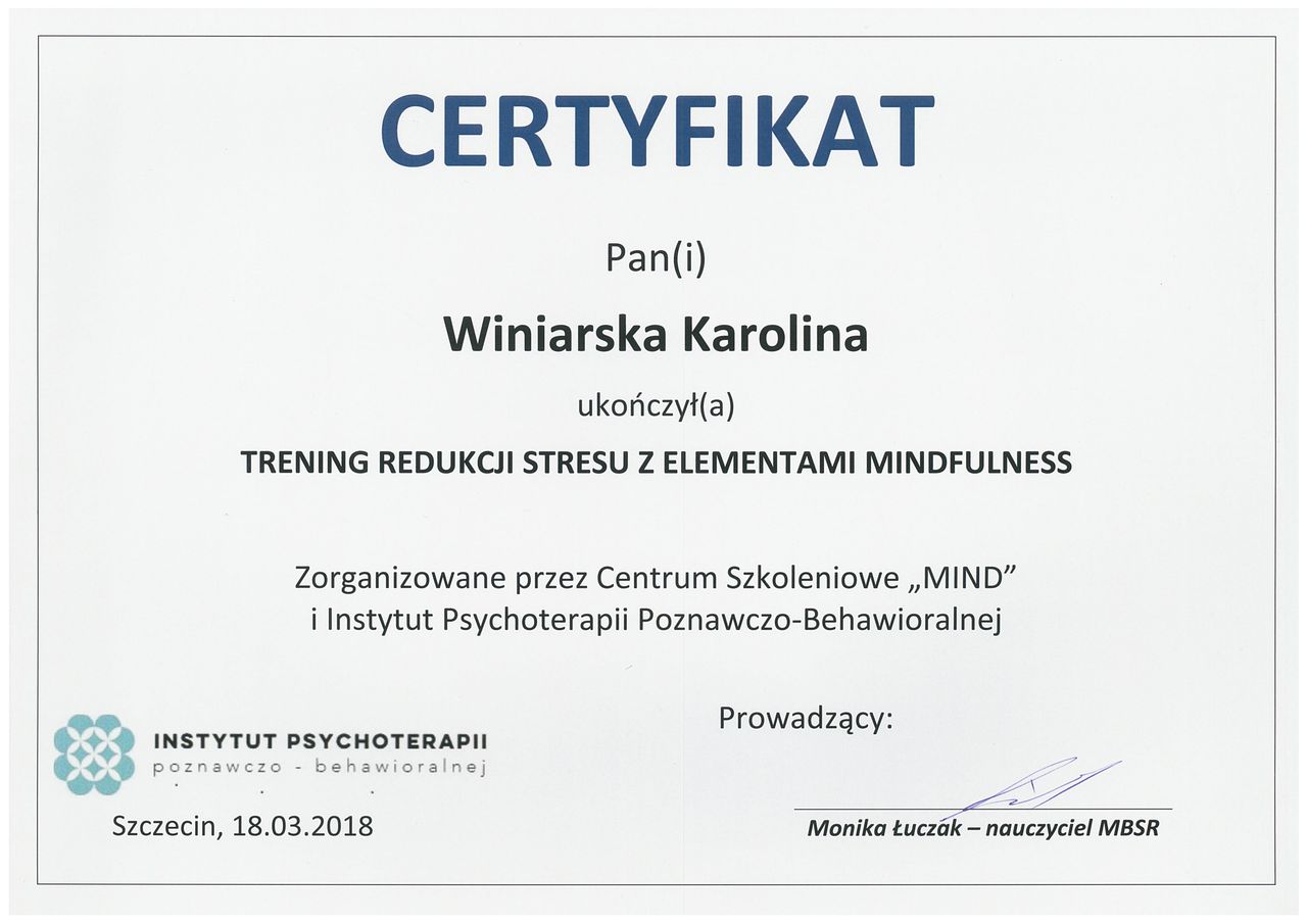Psycholog o spec. klinicznej, psycholog dzieci i młodzieży, asystent osoby z autyzmem oraz osoby z niepełnosprawnością, trener TUS, terapeuta metody Kids' Skills, terapeuta dialogu motywującego, psychoterapeuta systemowy w trakcie szkolenia w Wielkopolskim Towarzystwie Terapii Systemowej.
