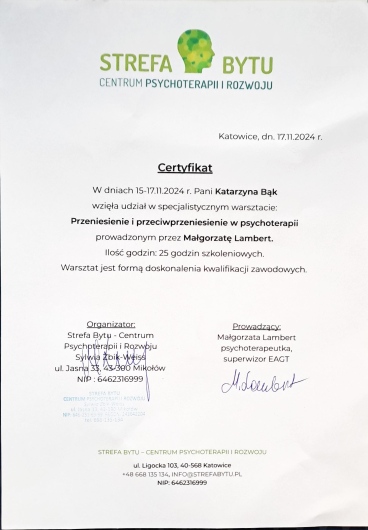 Z pełnym przekonaniem polecam Panią Katarzynę jako psychoterapeutkę, z która kontakt sam w sobie staje się doświadczeniem terapeutycznym. Jej autentyczność i otwartość budują przestrzeń, w której klienci mogą czuć się swobodnie i bezpiecznie – bez oceniania czy dystansu.
