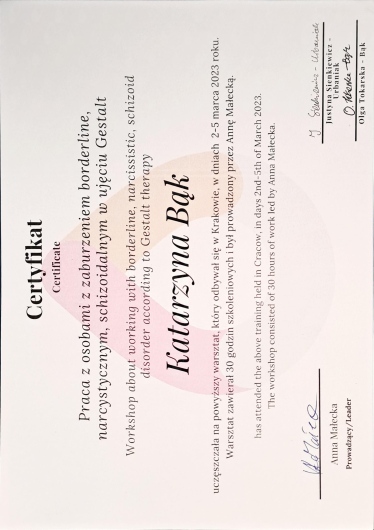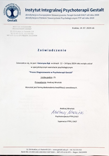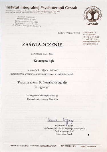Ukończyłam całościowe 4-letnie szkolenie psychoterapeutyczne w Instytucie Integralnej Psychoterapii Gestalt, akredytowanym przez European Association for Gestalt Therapy (EAGT) i Polskie Towarzystwo Psychologiczne (PTP). Obecnie jestem w trakcie procesu certyfikacji. Doświadczenie zawodowe zdobywałam pracując w organizacji wspierającej osoby z niepełnosprawnością i ich rodziny, jak również w trakcie stażu w Szpitalu Wojskowym w Krakowie na Klinicznym Oddziale Psychiatrycznym oraz w telefonie dla osób po stracie Fundacji “Nagle Sami”. Terapia Gestalt to dla mnie przede wszystkim prawdziwe spotkanie z drugim człowiekiem, oparte na ciekawości, otwartości i szczerości. Ważne jest dla mnie całościowe przyjęcie drugiej osoby, z szacunkiem do jej myśli, uczuć i tego, co doświadcza w ciele. Mam przekonanie, poparte doświadczeniem, że systematyczna psychoterapia pozwala na głęboką pracę relacyjną, której konsekwencją jest uświadomienie i zintegrowanie trudnych treści, a na dalszym etapie bardziej świadome i satysfakcjonujące życie. Pracuję w oparciu o Kodeks Etyczny Europejskiego Stowarzyszenia Psychoterapii Gestalt. Praktykę terapeutyczną poddaję regularnej superwizji indywidualnej i grupowej. Pracuję z osobami, które: - przeżywają kryzys emocjonalny - doświadczają poczucia wewnętrznej pustki - czują, że funkcjonują w trybie przetrwania, nie przeżywają życia w pełni - czują się niewystarczające, cierpią z powodu niskiego poczucia własnej wartości - doświadczają lęku - czują, że doszły w swoim życiu "do ściany" - cierpią z powodu samotności - doświadczają stanów depresyjnych - chcą lepiej poznać i zrozumieć siebie - doświadczają trudności w relacjach z innymi - przeżywają kryzys w związku - są w trakcie lub po rozstaniu, rozwodzie - mierzą się z wyzwaniami rodzicielstwa. Do gabinetu zapraszam osoby dorosłe i starszą młodzież od 16 roku życia.