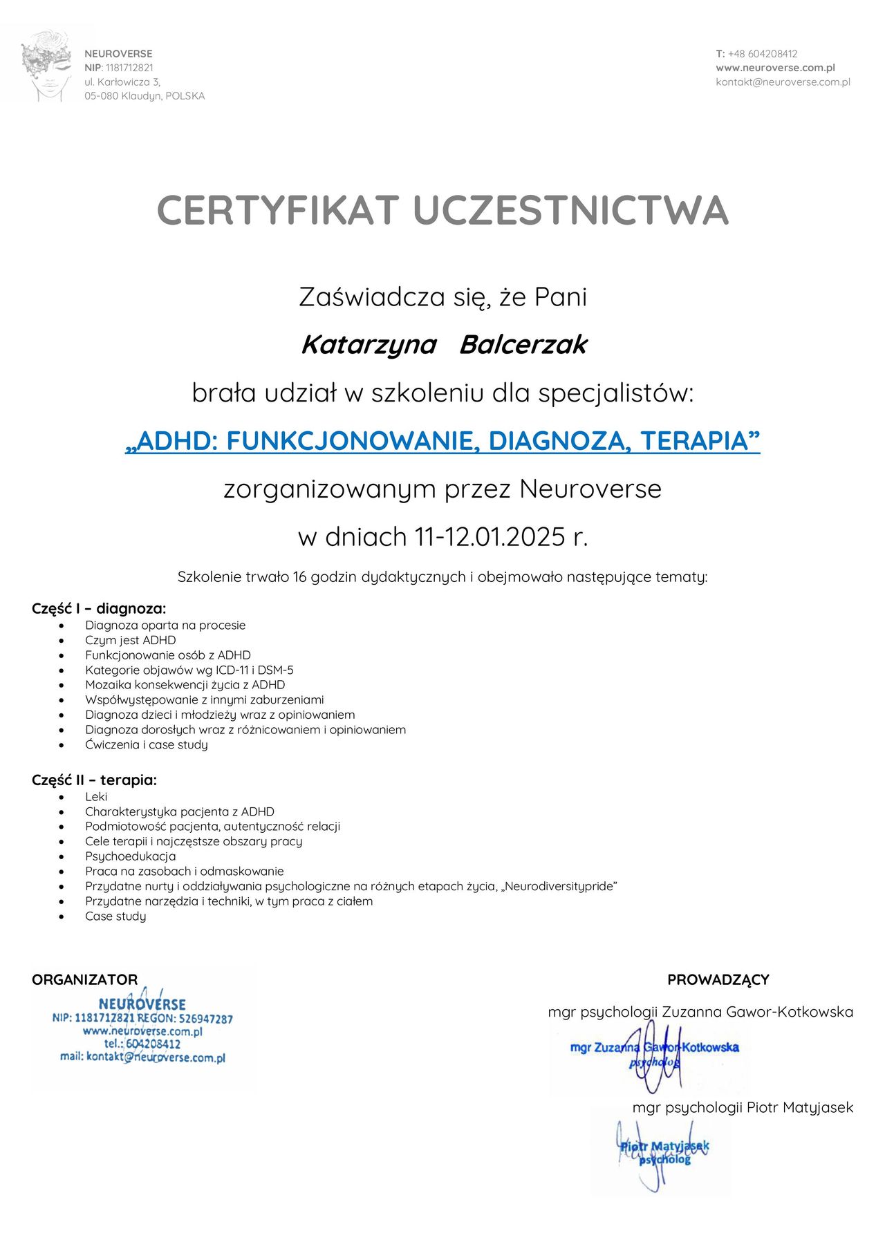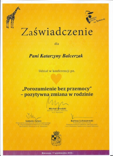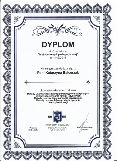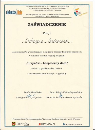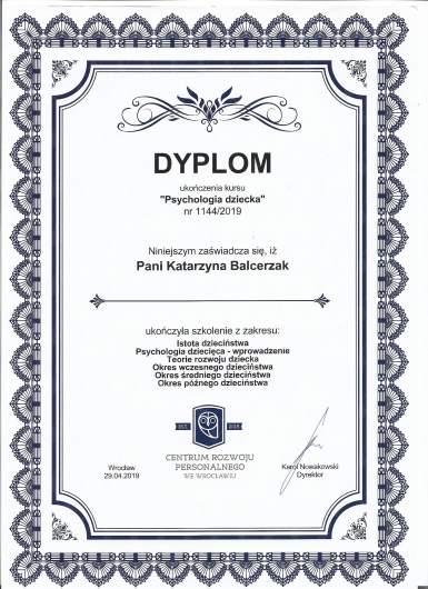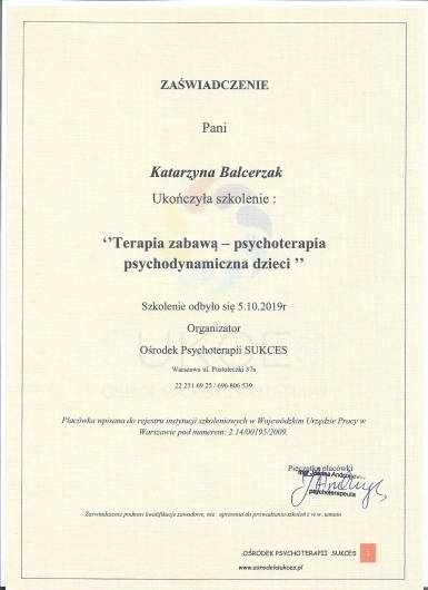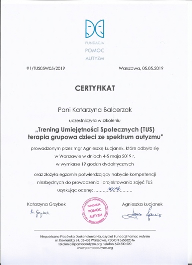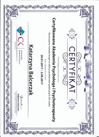 Obecnie ukończyłam 4-letnie szkoleni w zakresie psychoterapii atestowanego przez Sekcję Naukową Psychoterapii Polskiego Towarzystwa Psychiatrycznego, realizowane przez MABOR Centrum Psychologiczno-Medyczne oraz Centrum Doradztwa i Szkoleń w Warszawie, które szkoli psychoterapeutów do pracy w nurcie systemowym. Odbyłam liczne szkolenia z zakresu Porozumienia Bez Przemocy , Terapii Skoncentrowanej na Rozwiązaniach, metod terapii pedagogicznych, nowoczesnych metod terapii dziecka i dorosłych. Swoje doświadczenie zdobywałam m.in. pracując w Poradni Zdrowia Psychicznego w Szpitalu Bielańskim, na stażu w Szpitalu Wolskim im. dr Anny Gostyńskiej Samodzielny Publiczny Zakład Opieki Zdrowotnej, w Szpitalu Nowowiejskim na XI Oddziale Rehabilitacji Psychiatrycznej, w Ogólnopolskim Pogotowiu dla Ofiar Przemocy w Rodzinie “Niebieska Linia”, a także w Centrum Edukacji Terapii i Diagnozy TuMiRaj. Posiadam kwalifikacje do prowadzenia Treningów Umiejętności Społecznych.