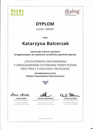 Od kilku lat jestem członkiem Polskiego Towarzystwa Psychiatrycznego oraz Sekcji Naukowej Terapii Rodzin. Moja praca jest pod stałym nadzorem certyfikowanego superwizora z Polskiego Towarzystwa Psychiatrycznego.