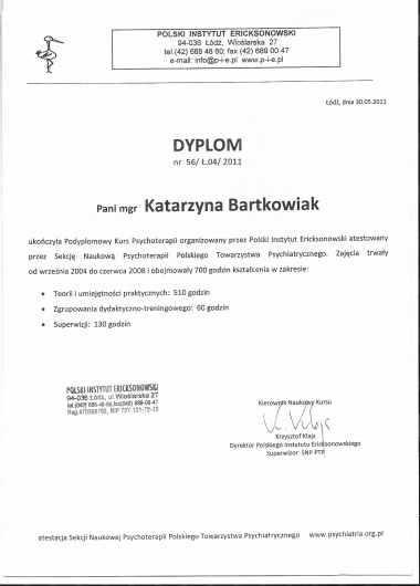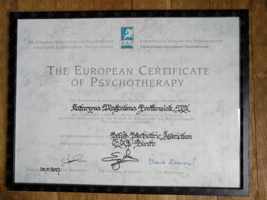 Jestem Certyfikowaną Psychoterapeutką EAP (European Association for Psychotherapy) z wieloletnim doświadczeniem (prowadzę psychoterapię od 20 lat). Ukończyłam Czteroletni Podyplomowy Kurs Psychoterapii atestowany przez Sekcję Naukową Psychoterapii Polskiego Towarzystwa Psychiatrycznego (2008r.) oraz liczne szkolenia z zakresu psychoterapii (m.in. Kurs Terapii Par, roczny Kurs Psychoterapii Traumy oraz Kurs Hipnozy I,II i III stopnia). Moje kompetencje potwierdza Europejski Certyfikat Psychoterapeuty EAP, który uprawnia do prowadzenia psychoterapii w większości krajów Unii Europejskiej. Korzystam ze stałej superwizji (jest to zewnętrzny nadzór pracy terapeuty).