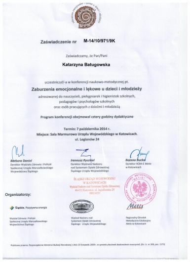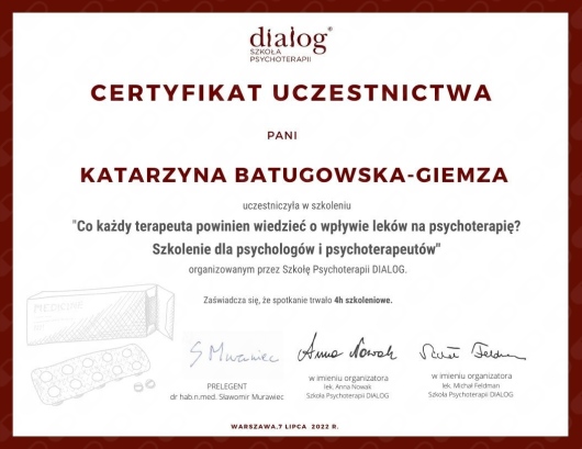 Jestem certyfikowanym psychoterapeutą poznawczo – behawioralnym (certyfikat numer 621) oraz absolwentką psychologii na Uniwersytecie Jagiellońskim w Krakowie. Certyfikat psychoterapeuty uzyskałam realizując czteroletnie szkolenie w Szkole Psychoterapii Poznawczo-Behawioralnej Uniwersytetu SWPS w Katowicach. Aktualnie realizuję całościowe szkolenie z Terapii Schematu (spełniające standardy ISST). Doświadczenie zawodowe zdobywałam m.in. w Centrum Psychiatrii w Katowicach na Oddziale Zaburzeń Afektywnych i Nerwicowych, Oddziale psychiatrycznym Szpitala Specjalistycznego im. Starkiewicza w Dąbrowie Górniczej, Szpitalu Uniwersyteckim w Krakowie oraz ośrodkach terapeutycznych i oświatowych. W trosce o jakość mojej pracy poddaję się regularnej superwizji oraz z dużą ciekawością poszerzam wiedzę uczestnicząc w licznych szkoleniach różnych szkół terapeutycznych. Jestem członkiem Polskiego Towarzystwa Psychologicznego oraz Polskiego Towarzystwa Terapii Poznawczo-Behawioralnej. W pracy terapeutycznej szczególnie bliska jest mi psychoterapia poznawczo-behawioralna oraz psychoterapia schematu, jednak staram się dobierać sposób pracy do indywidualnych potrzeb klienta. Od kilku lat z dużym zaciekawieniem wzbogacam swój warsztat terapeutyczny uczestnicząc w szkoleniach o modalności ericksonowskiej. Oferuję psychoterapię oraz wsparcie dla osób dorosłych. Szczególną uwagę poświęcam budowaniu relacji terapeutycznej opartej na wzajemnym zaufaniu, szacunku i wspólnym realizowaniu ustalonych celów. Na przestrzeni ostatnich lat zaprosiłam do współpracy psychoterapeutów różnych modalności i wspólnie tworzymy dla Państwa Centrum Psychoterapii SELF Batugowska. Bycie częścią zespołu Centrum Psychoterapii SELF Batugowska, daje mi możliwość poszerzania rozumienia klienta o perspektywę płynącą z innych modalności, m. in. poprzez uczestnictwo w regularnej superwizji zespołowej. Wierzę, że dobrze ukształtowana relacja daje człowiekowi poczucie bezpieczeństwa oraz chęć zaangażowania się w swój proces psychoterapeutyczny.
