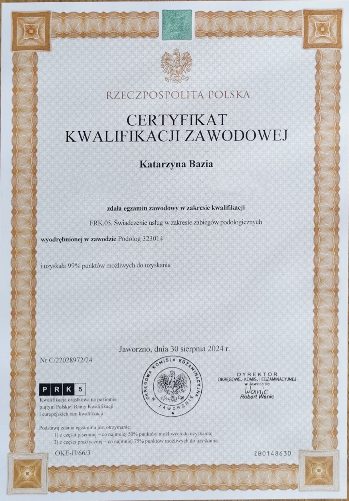 Jaki jest zakres porad oferowanych przez Katarzyna Bazia?Katarzyna Bazia to podolog. Na podstawie swojego doświadczenia i wykształcenia Katarzyna Bazia oferuje usługi takie jak: Konsultacja podologiczna, zabieg podologiczny, Usuwanie odcisków i modzeli, usuwanie modzeli i nagniotków, Klamra ortonyksyjna, Kompleksowa usługa podologiczna, usuwanie wrastających paznokci, leczenie chorób paznokci, pękające pięty, usuwanie brodawek wirusowych.