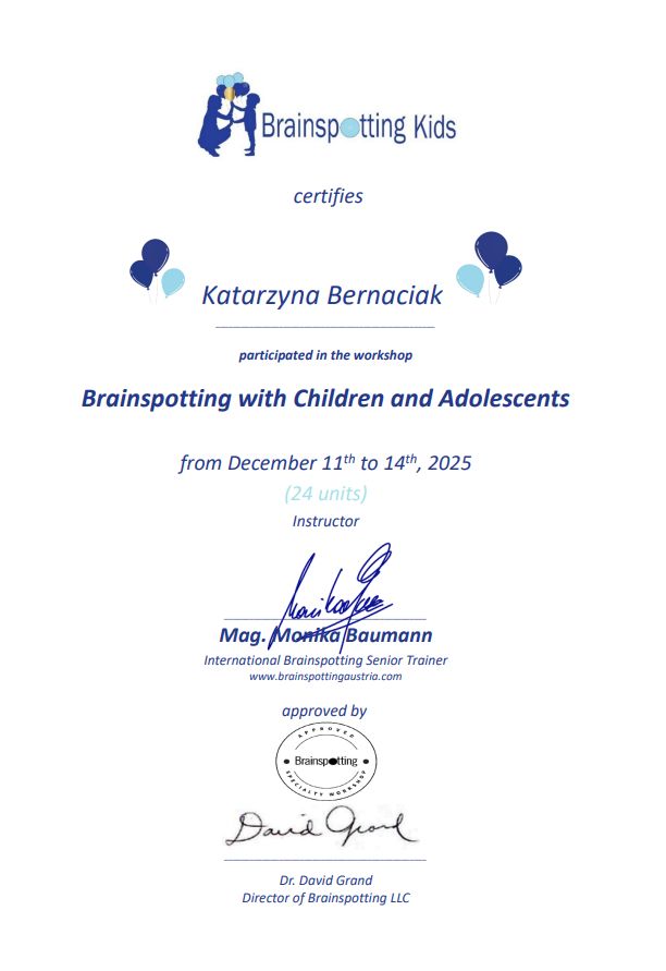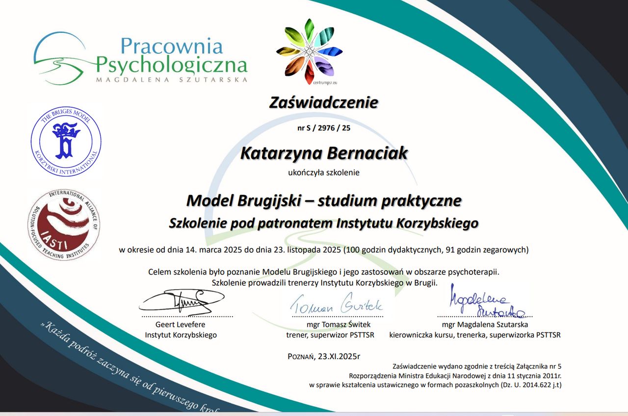 About me: I’m a psychotherapist in the process of certification and a holder of postgraduate degree in psychotraumatology. I work from a Solution-Focused Brief Therapy (SFBT) perspective, supporting adults, adolescents, couples, and families navigating crises, emotional overwhelm, or the aftermath of trauma – including complex and early childhood trauma. When working with children, I place great importance on supporting the whole system around the young person. That’s why I offer parental consultations, helping caregivers build relationships rooted in trust, respect, and a deeper understanding of their child’s needs. My work with parents is guided by the philosophies of Attachment Parenting, Resource-Oriented Parenting, and the approach of Jesper Juul. At the core of my work lies the therapeutic relationship – authentic, safe, and built on collaboration. SFBT, the approach I practice, focuses on your resources, goals, and what’s already working. Together, we explore moments where you thrive and identify what you need to move forward. I don't treat problems in isolation from your values and capacities – you are the expert on your own life. In trauma-informed work, I also use Brainspotting – a neuroexperiential method that helps access and process difficult emotions and experiences stored in the body and nervous system. It offers a safe, supportive way to work through trauma and reconnect with your inner strengths. When working with children and adolescents, especially after traumatic experiences, I incorporate the ARC model (Attachment, Regulation, Competence), which helps restore a sense of safety, develop emotional regulation, and support social competence in relationships. I have completed advanced training in Solution-Focused Therapy, including a 210-hour foundational and advanced course, a Family Therapy program, and numerous specialist workshops. I also practice crisis intervention and the Kids’ Skills method. My trauma training includes programs through The Trauma Research Foundation under Bessel van der Kolk and ARC training led by Margaret Blaustein. I am trained in Brainspotting (Phases 1 and 2) and hold a postgraduate degree in Psychotraumatology. My work is regularly supervised. I offer sessions in both Polish and English. You're warmly invited to begin this journey – at your own pace, with care and attention to what truly matters to you. Scope of Services Individual psychotherapy Adolescent psychotherapy Trauma therapy Systemic therapy Practice Location Spektrum Zmiany – Psychotherapy Practice ul. Bohaterów Westerplatte 11, Room 202 Zielona Góra, Poland