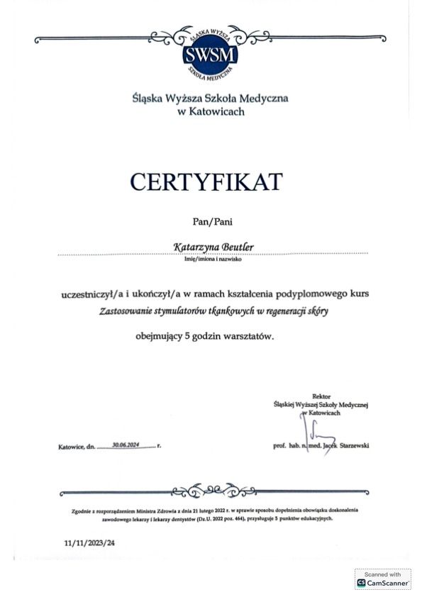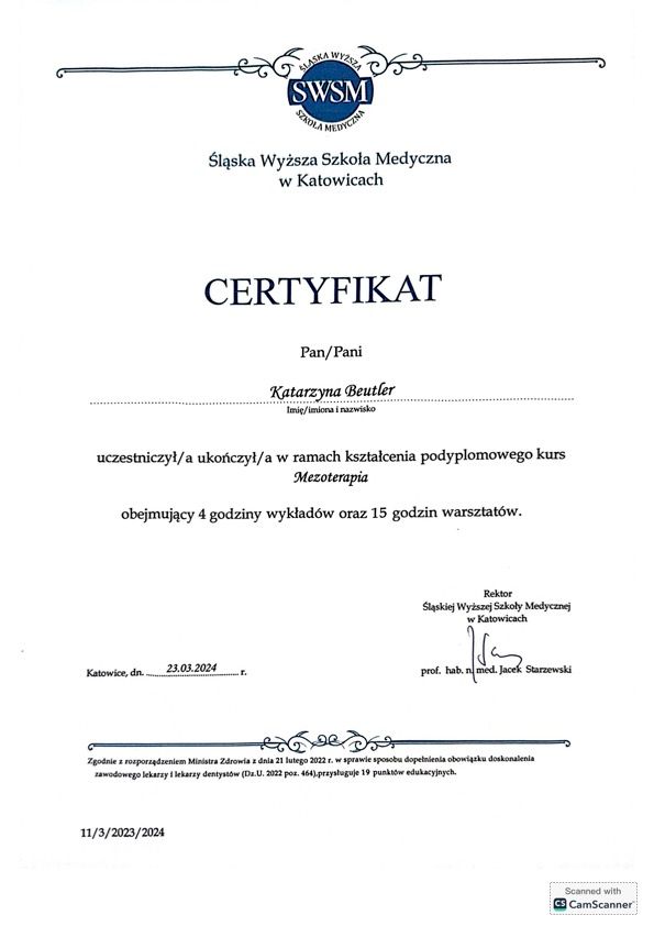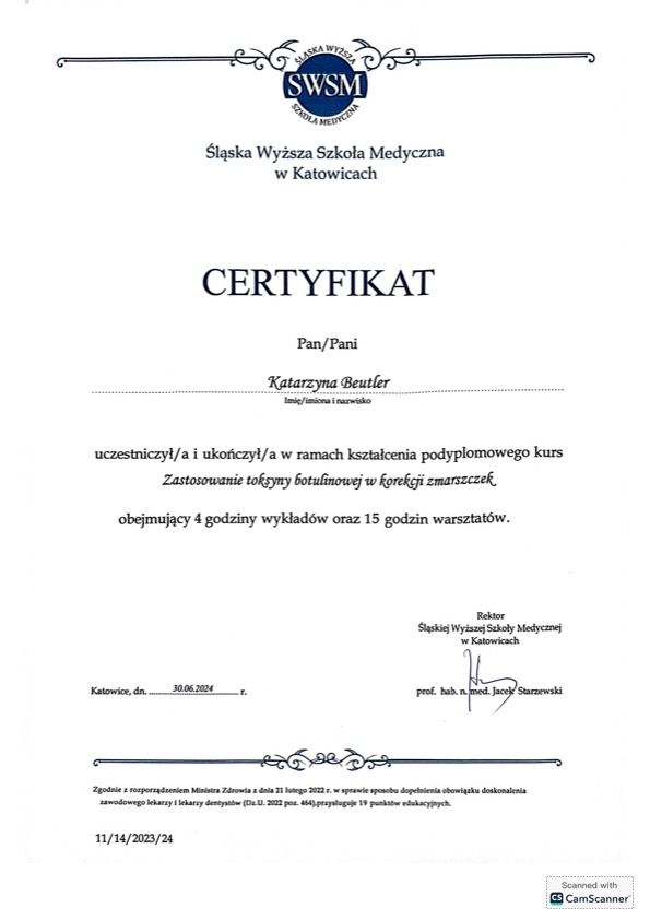 Jaki jest zakres porad oferowanych przez Katarzyna Beutler?Katarzyna Beutler to lekarz wykonujący zabiegi medycyny estetycznej, w trakcie specjalizacji (dermatolog). Na podstawie swojego doświadczenia i wykształcenia Katarzyna Beutler oferuje usługi takie jak: Konsultacja z zakresu medycyny estetycznej, baby botox, Botoks, Toksyna botulinowa 1 okolica, Botoks - linie poprzeczne czoła, Toksyna botulinowa zmarszczki królicze, Toksyna botulinowa- broda, botoks- kurze łapki, Botoks - lwia zmarszczka, Toksyna botulinowa 2 okolice.