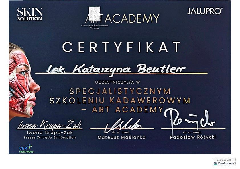 Jestem absolwentką kierunku Lekarskiego na Uniwersytecie Medycznym im. Karola Marcinkowskiego w Poznaniu. Ukończyłam studia podyplomowe z Medycyny Estetycznej na Śląskiej Wyższej Szkole Medycznej w Katowicach. Aktualnie odbywam szkolenie specjalizacyjne z Dermatologii i Wenerologii. Jestem członkiem Polskiego Towarzystwa Dermatologicznego. Nieustannie poszerzam swoją wiedzę, uczestnicząc w kursach i szkoleniach, aby być na bieżąco z najnowszymi osiągnięciami w medycynie estetycznej. Do każdego pacjenta podchodzę indywidualnie, dostosowując zabiegi do jego potrzeb, oczekiwań oraz kondycji skóry, by zapewnić bezpieczne i skuteczne rezultaty.