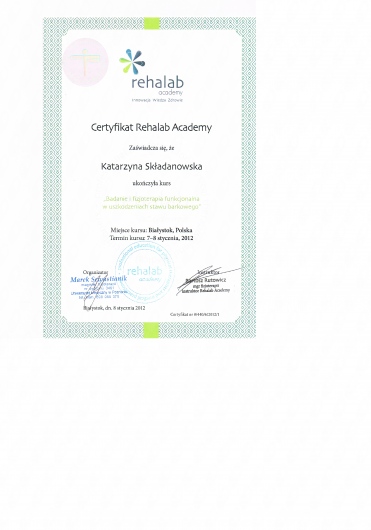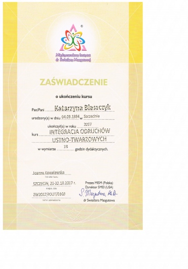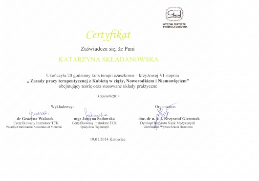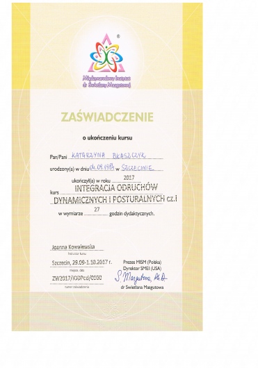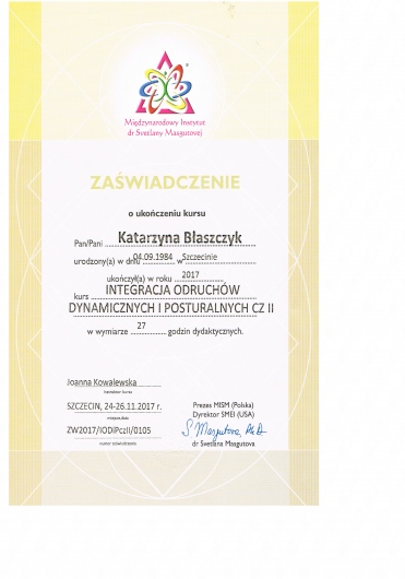 W terapii wykorzystuję wiedzę zdobytą na kursach, m. in.: Osteoaptia, NDT Bobath, terapia Vojty Trójpłaszczyznowa terapia manualna stóp, Terapia czaszkowo-krzyżowa, Integracja sensoryczna , nie przeprowadzam diagnoz SI , Terapia Neurotaktylna Kinesiology taping