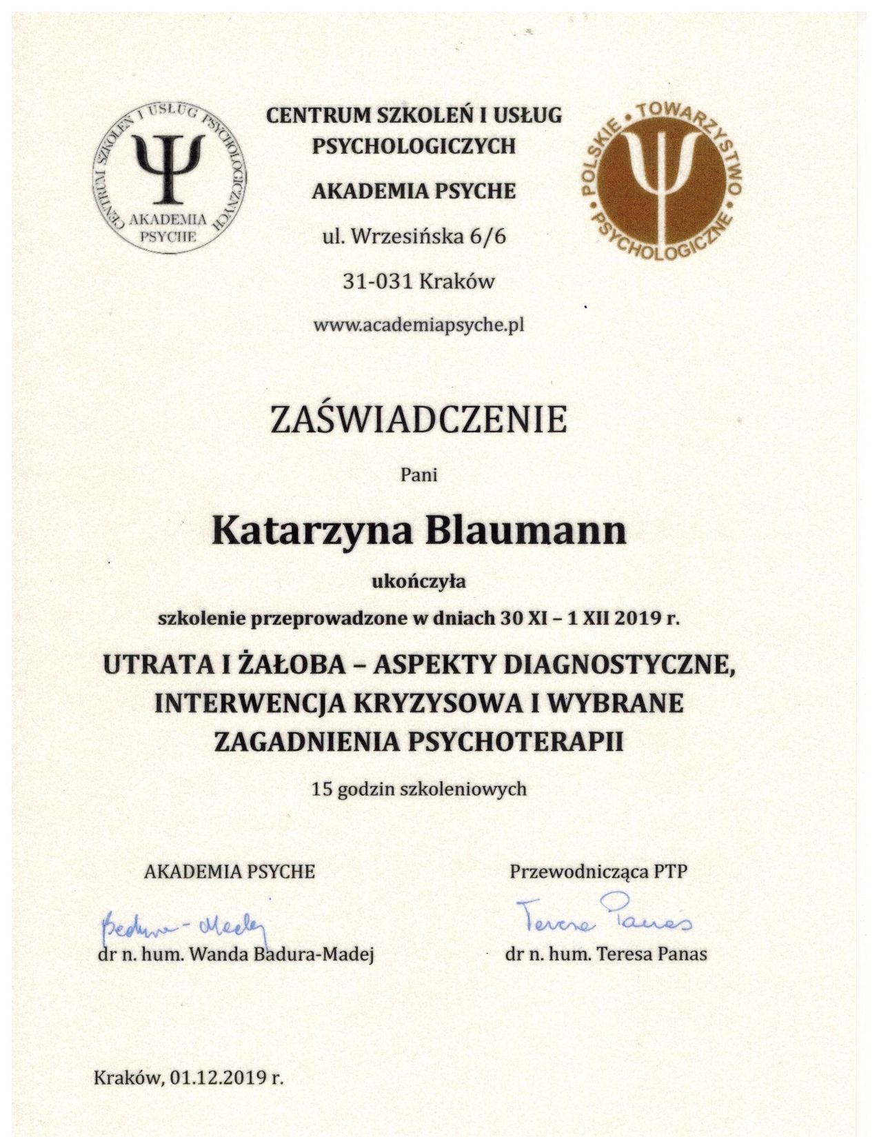Jestem psychologiem, psychoonkologiem oraz psychoterapeutką w trakcie całościowego, czteroletniego szkolenia psychoterapeutycznego w nurcie psychodynamicznym na Uniwersytecie Jagiellońskim (IV rok). Obecnie poszerzam swoje kompetencje, uczestnicząc w specjalistycznym rocznym szkoleniu dla terapeutów par „Terapia małżeństw i par ze szczególnym uwzględnieniem podejścia systemowego”, organizowanym przez Krakowską Fundację Rozwoju Psychoterapii im. Prof. Marii Orwid, a także w studiach podyplomowych z zakresu suicydologii – psychologicznych podstaw zachowań samobójczych i profilaktyki samobójstw.