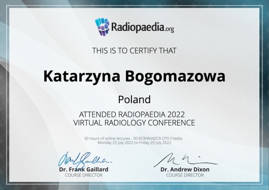 Jestem specjalistą Radiologii i Diagnostyki Obrazowej. Studia medyczne ukończyłam na Wydziale Lekarskim Białoruskiego Państwowego Uniwersytetu Medycznego w Mińsku (2015). W 2018 roku pomyślnie zakończyłam proces nostryfikacji dyplomu lekarskiego na Uniwersytecie Jagiellońskim w Krakowie, po czym odbyłam staż podyplomowy w 5. Wojskowym Szpitalu Klinicznym z Polikliniką SPZOZ w Krakowie.
