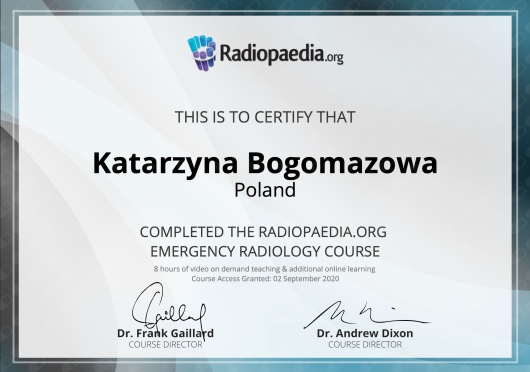 Swoją przygodę z radiologią rozpoczęłam w 2020 roku, w trudnym czasie pandemii COVID-19, w Wojewódzkim Szpitalu Specjalistycznym w Legnicy, gdzie zdobyłam cenne doświadczenie zawodowe. Dziś swoją wiedzę i doświadczenie rozwijam w Dolnośląskim Centrum Onkologii, Pulmonologii i Hematologii we Wrocławiu (dawniej Dolnośląskie Centrum Chorób Płuc).