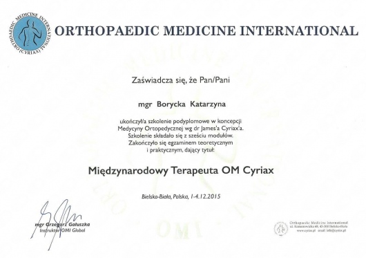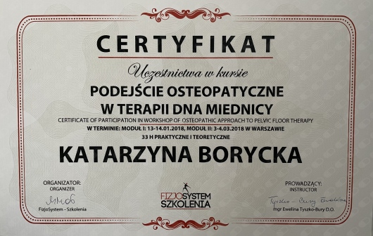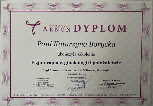 Ukończyłam Śląski Uniwersytet Medyczny. Specjalizuję się w diagnostyce ultrasonograficznej mięśni dna miednicy. Jestem certyfikowaną terapeutką Medycyny Ortopedycznej wg Cyriax'a oraz fizjoterapeutką uroginekologiczną. W pracy z pacjentką wykorzystuję podstawy metody Pilates. Pracuję z kobietami w ciąży, młodymi mamami po porodzie siłami natury jak i cięciu cesarskim oraz pacjentkami w okresie menopauzalnym lecząc zaburzenia statyki mięśni dna miednicy. Stale podnoszę swoje kwalifikacje uczestnicząc w sympozjach naukowych i specjalistycznych kursach.