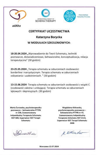 Stale doskonale swój warsztat pracy, poprzez udział w kursach i szkoleniach rekomendowanych przez Polskie Towarzystwo Terapii Poznawczo-Behawioralnej oraz International Society of Schema Therapy. Swoją pracę poddaję regularnej superwizji. Pracuję zgodnie z zasadami etyki zawodu psychologa oraz psychoterapeuty.