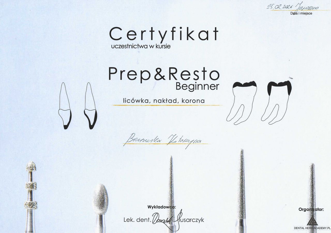 Ukończyłam Uniwersytet Medyczny w Łodzi. W swojej codziennej praktyce koncentruję się na nowoczesnej stomatologii zachowawczej, leczeniu endodontycznym oraz odbudowach protetycznych, takich jak korony i nakłady. Szczególną uwagę poświęcam precyzji leczenia – pracuję w powiększeniu z wykorzystaniem mikroskopu stomatologicznego, co pozwala na bardzo dokładną diagnostykę i terapię.