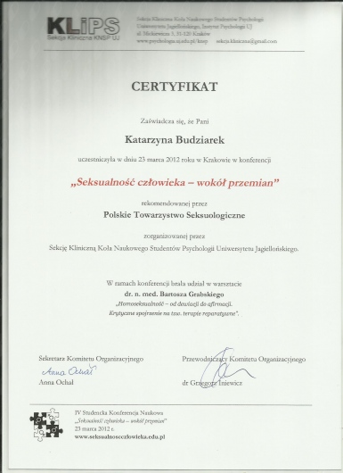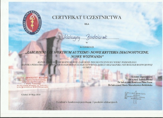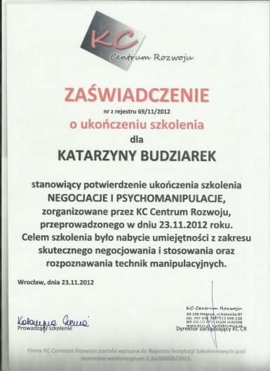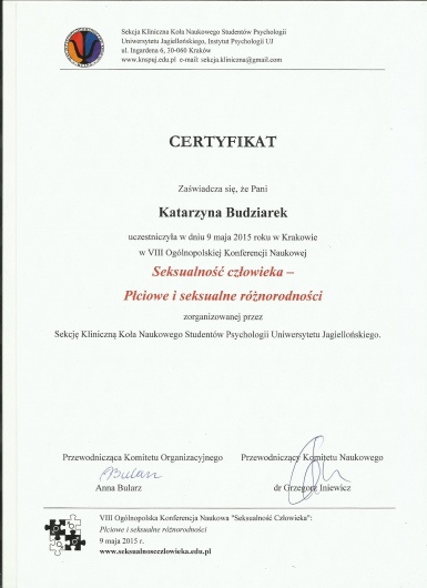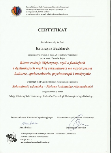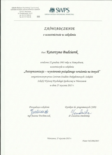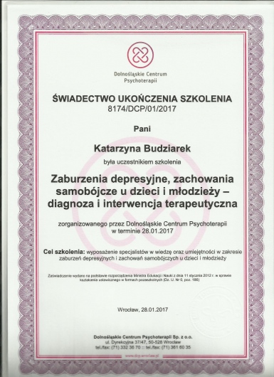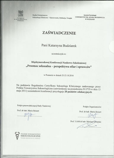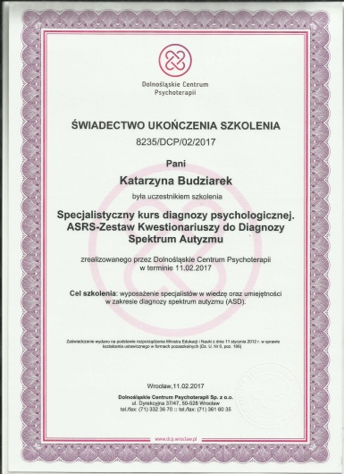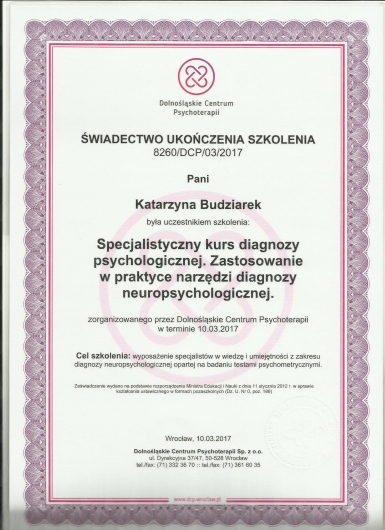 Jestem absolwentką pięcioletnich studiów magisterskich w Szkole Wyższej Psychologii Społecznej we Wrocławiu gdzie uzyskałam tytuł mgr Psychologii. Ukończyłam także dwuletnie studia podyplomowe na Uniwersytecie Adama Mickiewicza w Poznaniu, kierunek: „Seksuologia Kliniczna – Opiniowanie, Edukacja, Terapia” oraz Studium Psychologii Sądowej. Obecnie jestem w trakcie szkolenia w celu uzyskania certyfikatu psychoterapeuty poznawczo-behawioralnego (Szkoła Psychoterapii Poznawczo-Behawioralnej przy Uniwersytecie SWPS). Jestem członkiem Polskiego Towarzystwa Terapii Poznawczej i Behawioralnej (PTTPB). Ukończyłam również półroczny staż w Zakładzie Karnym w Oleśnicy na Oddziale Terapeutycznym dla przestępców seksualnych. Pracowałam na Oddziale i w Poradniach Zdrowia Psychicznego w Dziennym Ośrodku Psychiatrii i Zaburzeń Mowy dla Dzieci i Młodzieży we Wrocławiu, gdzie zdobywałam umiejętności w zakresie psychoterapii indywidualnej oraz grupowej. Swoje doświadczenie zawodowe zdobywałam również podczas praktyk w Miejskiej Poradni Psychologiczno-Pedagogiczna w Opolu, żłobku „Kraina Elfów”, a także pracując w domu dziecka. Swoją wiedzę nieustannie poszerzam biorąc udział w licznych kursach, szkoleniach i konferencjach naukowych m.in.: „Specjalistyczny Kurs diagnozy neuropsychologicznej. ASRS-Zestaw Kwestionariuszy do diagnozy spektrum autyzmu”, „Zaburzenia depresyjne, zachowania samobójcze u dzieci i młodzieży - diagnoza i interwencja terapeutyczna”. Swoją pracę poddaję regularnej superwizji.
