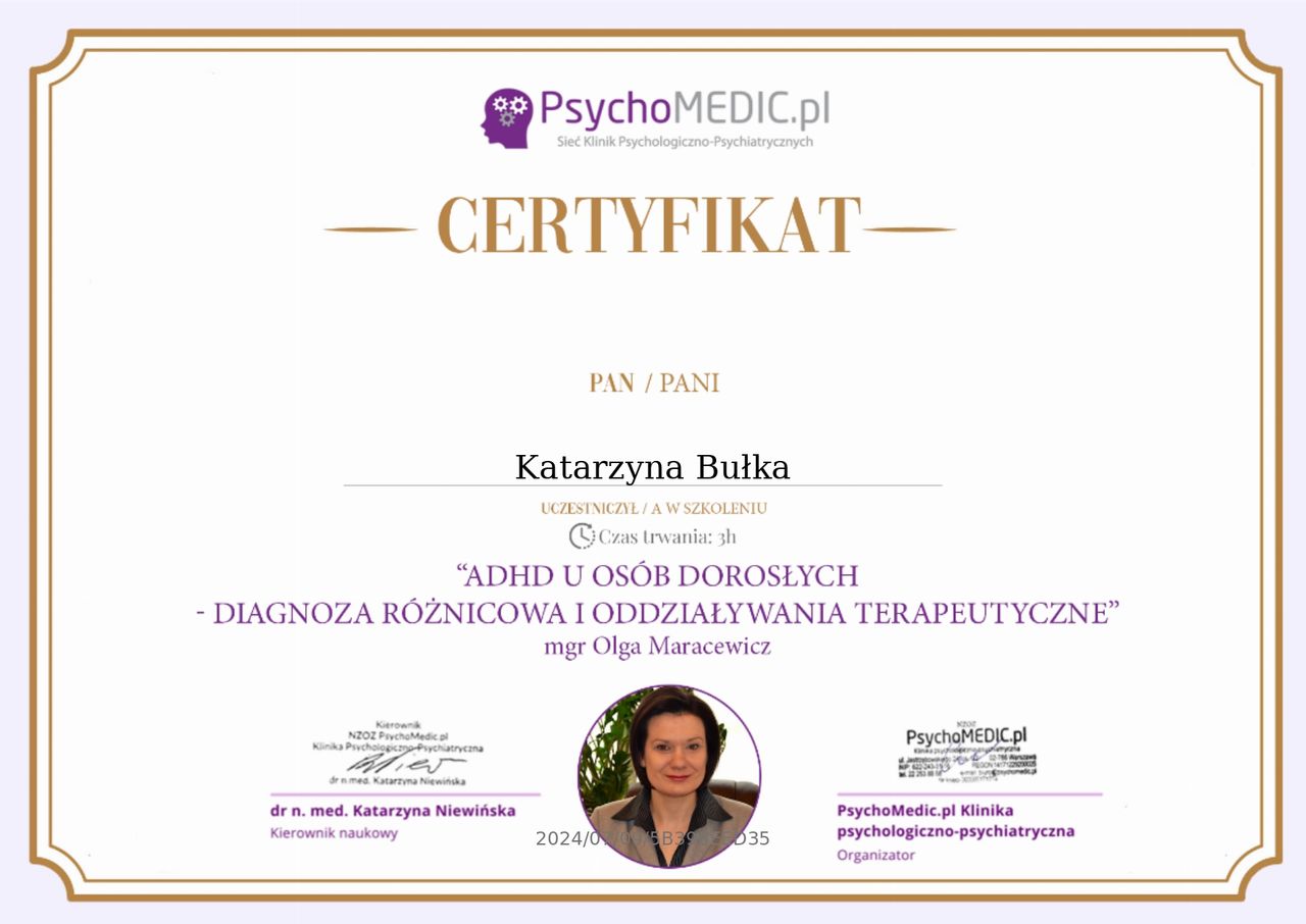 Długo zbierałam się, żeby pójść na diagnozę, do której początkowo byłam nastawiona nieco sceptycznie - ostatecznie uważam, że ten krok był dla mnie niesamowicie uwalniający i absolutnie konieczny, aby móc ,,ruszyć z miejsca''. Diagnoza rozwiała wątpliwości, zredukowała towarzyszące mi nieustannie napięcie oraz uczucie zagubienia. Proces diagnostyczny przeprowadzony przez Panią Katarzynę stał się częścią bardzo ważnej dla mnie zmiany w kierunku lepszego rozumienia siebie. Pani Katarzyna posiada dużą, nowoczesną wiedzę o ADHD, a do tego jest bardzo uważną na drugiego człowieka, sympatyczną osobą. Wizyty przebiegały w bardzo komfortowej atmosferze, wywiad diagnostyczny przeplatany był różnymi anegdotkami, naprowadzeniami i elementami psychoedukacyjnymi. Diagnoza została przeprowadzona bardzo rzetelnie i profesjonalnie - Pani Katarzyna zwracała uwagę na wiele aspektów funkcjonowania, chcąc otrzymać jak najbardziej całościowy obraz mojego przypadku. Polecam bardzo serdecznie!