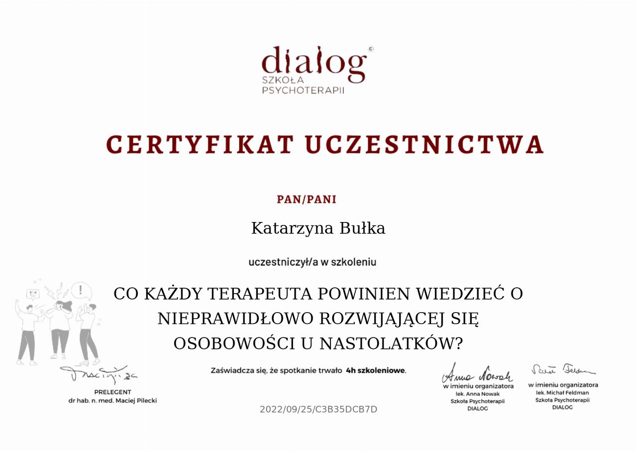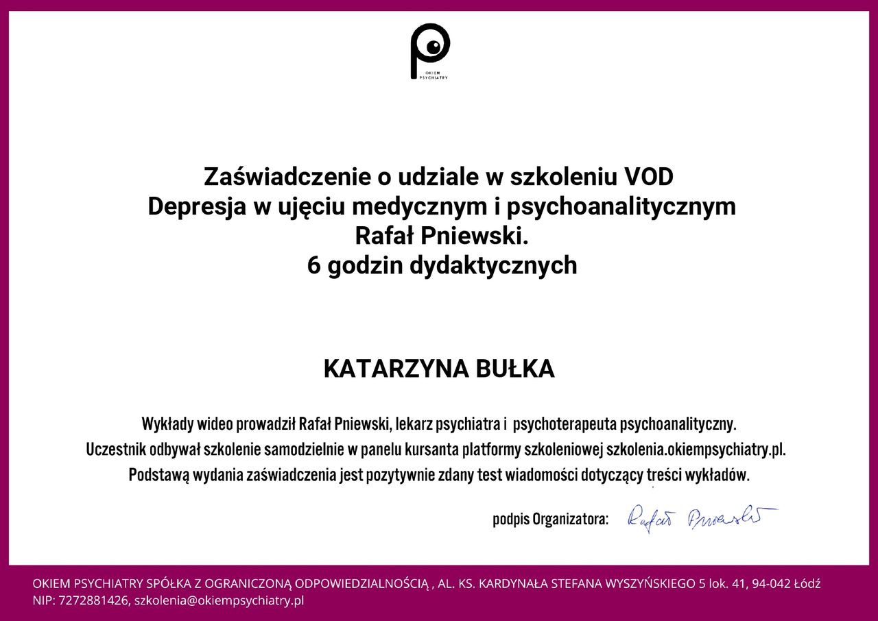 Jaki jest zakres porad oferowanych przez Katarzyna Bułka?Katarzyna Bułka to psycholog, psychoterapeuta. Na podstawie swojego doświadczenia i wykształcenia Katarzyna Bułka oferuje usługi takie jak: Konsultacja psychologiczna, psychological consultation in English, Diagnoza autyzmu, konsultacja diagnostyczna ADHD dorosłych, Psychoterapia, psychotherapy in English, konsultacja psychoterapeutyczna, konsultacja psychologiczna dla studentów (online).