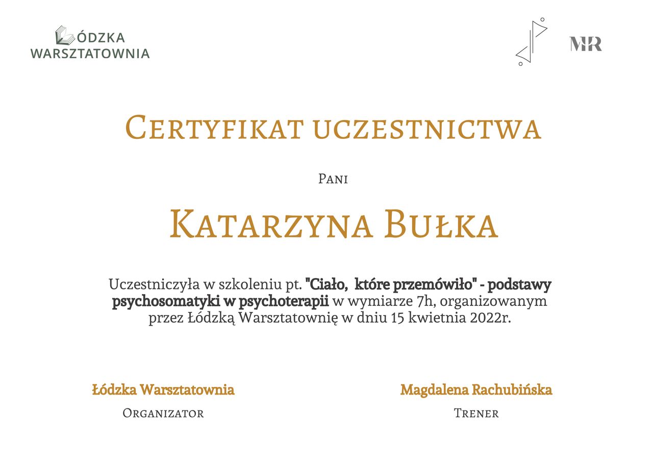Do Pani Katarzyny trafiłam w zasadzie przez przypadek, ale okazało się, że było to jedne z moich najlepszych doświadczeń z psychologami. Pani Katarzyna jest empatyczna a rozmowa z nią poza oczywistym profesjonalizmem przeplatana była różnymi anegdotami, które pomagały mi poczuć się komfortowo . Czułam się zrozumiana i dzięki temu doświadczeniu i diagnozie wierzę, że będzie lepiej.