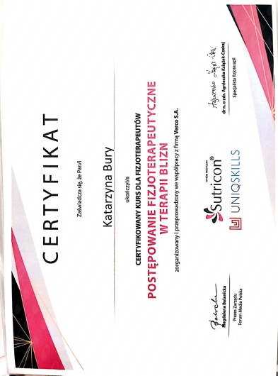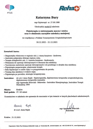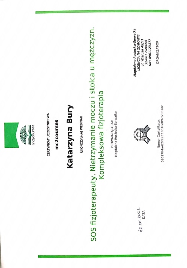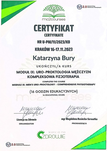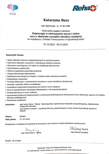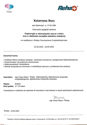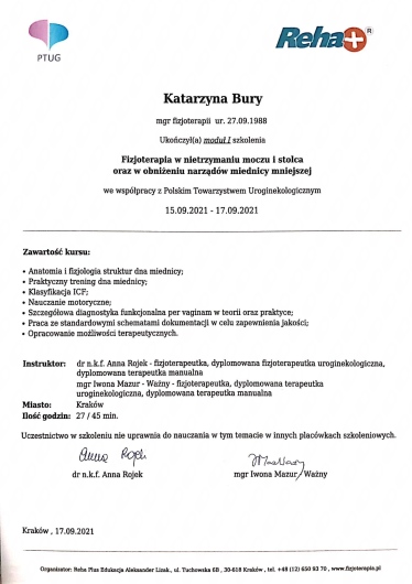 Jaki jest zakres porad oferowanych przez Katarzyna Bury?Katarzyna Bury to fizjoterapeuta. Na podstawie swojego doświadczenia i wykształcenia Katarzyna Bury oferuje usługi takie jak: konsultacja fizjoterapeutyczna, rehabilitacja uroginekologiczna, fizjoterapia uroginekologiczna, fizjoterapia proktologiczna.