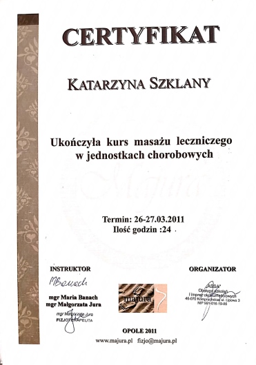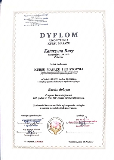 Pani Katarzyna Bury to wspaniała fizjoterapeutka! Wszystko zostało jasno i szczegółowo wyjaśnione. Pani Kasia jest niezwykle miła, serdeczna i profesjonalna – od razu czuć, że pacjent jest w dobrych rękach. Dodatkowo pokazała mojemu mężowi, jak krok po kroku naklejać tejpy, co bardzo ułatwi mi codzienne funkcjonowanie. Co najważniejsze – ból ustąpił już po wizycie, a ja mogłam wreszcie odetchnąć z ulgą. Ogromnie polecam każdemu, kto szuka skutecznej pomocy w przyjaznej atmosferze.