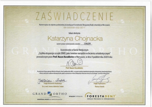 Staż podyplomowy lekarza dentysty odbyłam w Mazowieckim Centrum Stomatologii w Warszawie, a trzyletnie szkolenie specjalizacyjne w dziedzinie ortodoncji odbyłam w Centralnym Szpitalu Klinicznym w Łodzi w trybie rezydentury uzyskując tytuł specjalisty ortodoncji.