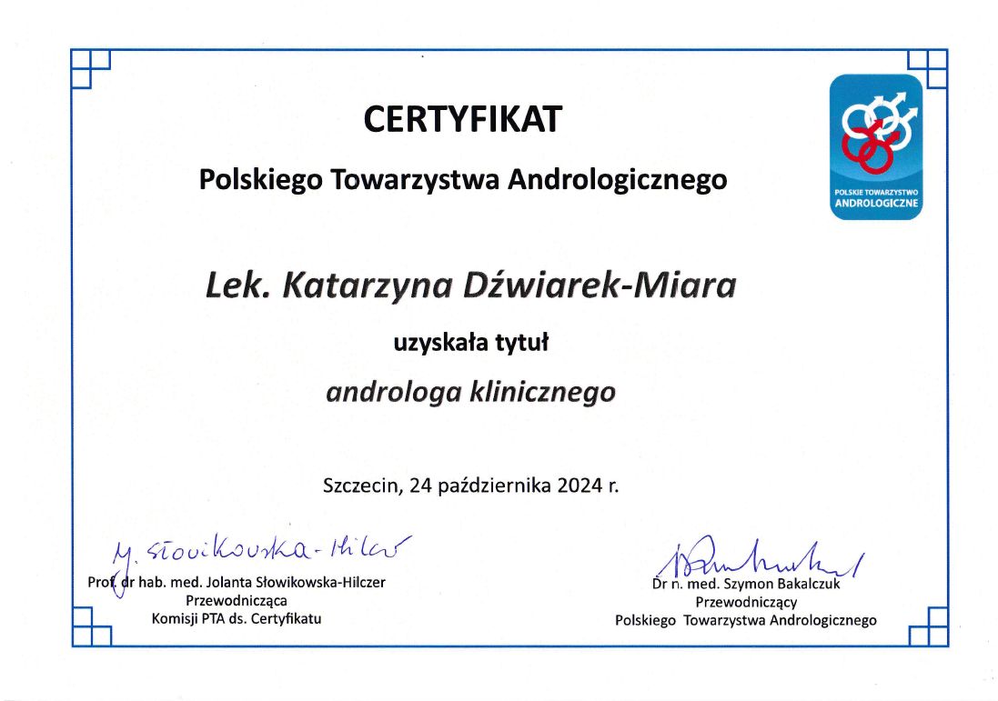 Stale poszerzam swoją wiedzę uczestnicząc w konferencjach i kursach. Jestem członkiem Polskiego Towarzystwa Andrologicznego.