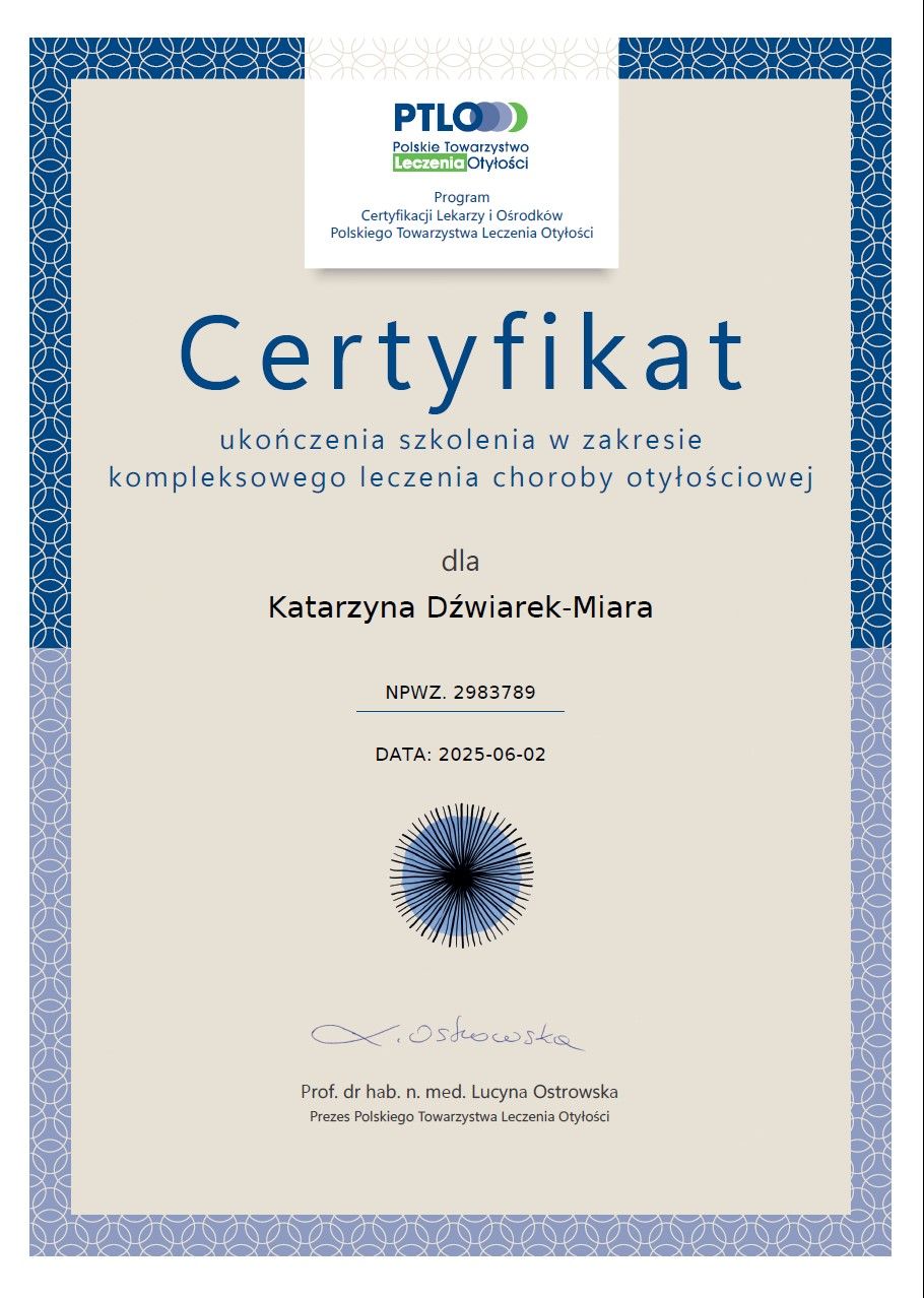 5 opiniiSpecjalistka chorób wewnętrznych, endokrynologii i diabetologii. Posiadam certyfikat andrologii klinicznej Polskiego Towarzystwa Andrologicznego oraz certyfikat w zakresie leczenia otyłości Polskiego Towarzystwa Leczenia otyłości.