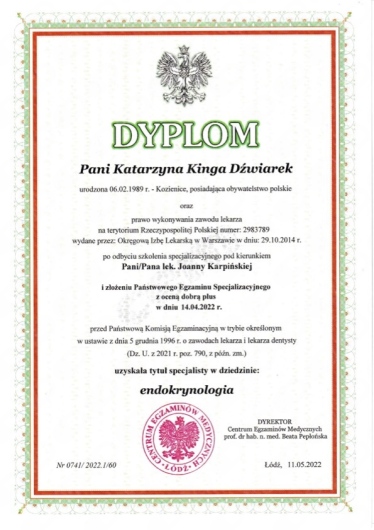 Jestem absolwentką II Wydziału Lekarskiego Warszawskiego Uniwersytetu Medycznego. Od 2015r jestem związana z Kliniką Chorób Wewnętrznych, Endokrynologii i Diabetologii PIM MSWiA w Warszawie. Łącząc wiedzę i doświadczenie z różnych dziedzin w sposób holistyczny zajmuje się diagnostyką i leczeniem chorób endokrynologicznych (ze szczególnym uwzględnieniem tarczycy, przytarczyc, nadnerczy, przysadki mózgowej), niedoboru testosteronu, a także kompleksowym leczeniem otyłości i zaburzeń gospodarki węglowodanowej. Wykonuję także badanie ultrasonograficzne tarczycy.