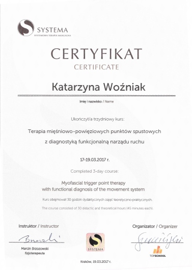 Specjalizuję się w terapii punktów spustowych, terapii mięśniowo-powięziowej, mobilizacji tkanek miękkich oraz terapii blizn – kluczowej w procesie rehabilitacji pooperacyjnej i pourazowej. Prowadzę również treningi powięziowe oraz edukuję pacjentów w zakresie autoterapii, stretchingu i ergonomii ruchu.