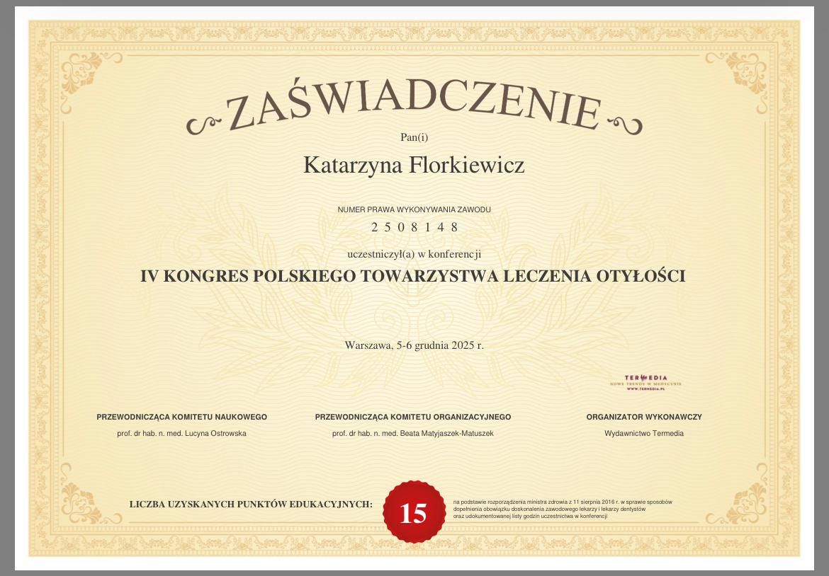 Jestem lekarzem specjalistą Medycyny Rodzinnej oraz certyfikowanym lekarzem Obesitologiem. Studia medyczne ukończyłam na Uniwersytecie Medycznym w Poznaniu a szkolenie specjalizacyjne z medycyny rodzinnej w katedrze Medycyny Rodzinnej w Poznaniu. Posiadam ponad 10 letnie doświadczenie pracy jako lekarz rodzinny. Pracowałam w licznych placówkach zarówno prywatnych jak i państwowych. Obecnie leczę tylko osoby dorosłe a głównym przedmiotem moich zainteresowań jest choroba otyłościową i jej następstwa. W ostatnich latach odbyłam liczne szkolenia i kursy w tym zakresie m. in. uzyskałam tytuł Certyfikowanego Lekarza Polskiego Towarzystwa Leczenia Otyłości. Podczas świadczonych porad internistycznych i obesitologicznych zawsze podchodzę do swoich Pacjentów całościowo - oferując im jak najszersze możliwości diagnostyki a później leczenia. Aby jeszcze lepiej służyć moim Pacjentom ukończyłam wstępne szkolenie z Medycyny Stylu Życia oraz liczne szkolenia z diabetologii, medycyny rodzinnej a także chorób wewnętrznych. Ponadto jestem członkiem Polskiego Towarzystwa Leczenia Otyłości, Polskiego Towarzystwa Medycyny Stylu Życia oraz Polskiego Towarzystwa Medycyny Rodzinnej.