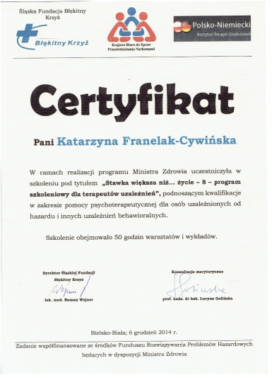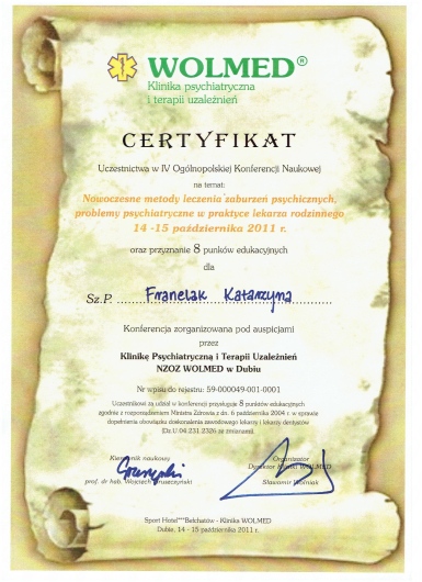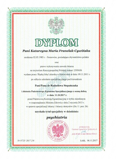 Jestem absolwentką Śląskiej Akademii Medycznej (2004-2010). Po odbyciu stażu podyplomowego związałam się z Kliniką Psychiatryczną i Terapii Uzależnień „Wolmed” w Szczercowie, a następnie rozpoczęłam specjalizację w Klinice Psychiatrii i Psychoterapii w Katowicach - Ochojcu. W październiku 2017r. uzyskałam tytuł specjalisty psychiatrii po uzyskaniu pozytywnego wyniku Państwowego Egzaminu Specjalizacyjnego. Rozpoczęłam również proces certyfikacyjny terapeuty uzależnień w ramach Polsko - Niemieckiego Instytutu Terapii Uzależnień. Pracuję obecnie w Wojewódzkim Szpitalu Neuropsychiatrycznym w Lublińcu, Centrum Zdrowia Psychicznego, Oddziale Dziennym Terapii Uzależnienia od Alkoholu, a także w sektorze prywatnym. Oprócz podejścia biologicznego i farmakoterapii chorób oraz zaburzeń psychicznych, specjalizuję się w terapii osób dorosłych w zakresie uzależnień od substancji psychoaktywnych. Jestem członkiem Polskiego Towarzystwa Psychiatrycznego. Nieustannie pogłębiam swoją wiedzę, aby spełniać oczekiwania moich pacjentów. Czas trwania wizyt diagnostycznych wynosi do 40 minut. Wizyta diagnostyczna obejmuje wywiad, ocenę psychiatryczną i wstępną ocenę terapeutyczną. Czas wizyt kontrolnych do 20 minut. Powyższe zakresy czasowe dotyczą również konsultacji zdalnych. Możliwe są również wizyty domowe po wcześniejszym uzgodnieniu. Wizyty odbywają się stacjonarnie na miejscu w gabinecie lub zdalnie (przez platformę znanego lekarza, Whatsapp, telefonicznie lub Signal). Jednocześnie zaznaczam, że w przypadku psychiatrii przebieg konsultacji zdalnej niewiele się różni od konsultacji na żywo dlatego proszę się ich nie obawiać, a jednocześnie nie muszą Państwo tracić czasu na dojazd do ośrodka i nie narażacie się na zakażenie w razie zagrożenia epidemiologicznego. W razie pytań proszę o kontakt.
