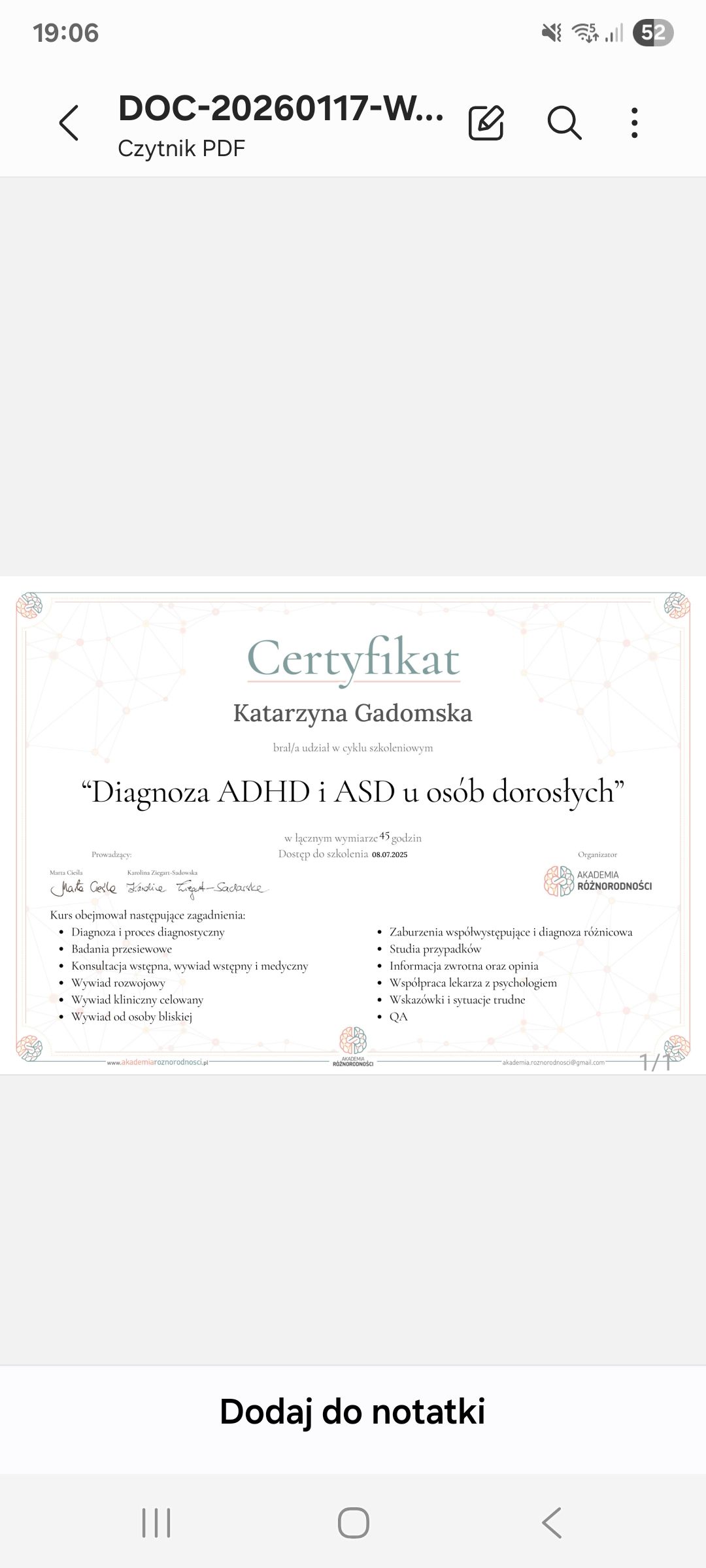 Jaki jest zakres porad oferowanych przez Katarzyna Gadomska ?Katarzyna Gadomska to psycholog. Na podstawie swojego doświadczenia i wykształcenia Katarzyna Gadomska oferuje usługi takie jak: Konsultacja psychologiczna, diagnoza ADHD dla dorosłych, Coaching ADHD, Konsultacja psychologiczna online.