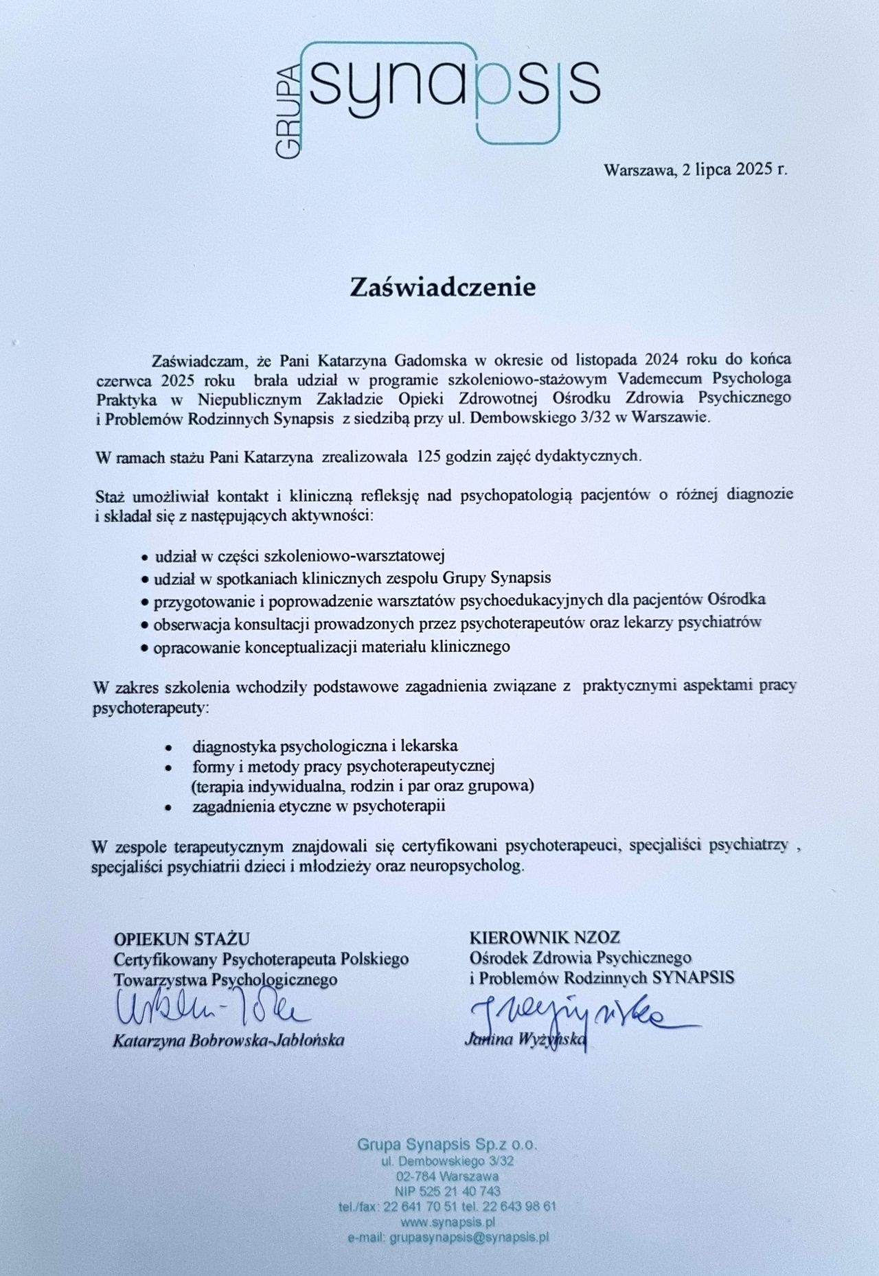 Czy Katarzyna Gadomska przyjmuje online, bez konieczności pojawiania się w placówce?Tak, Katarzyna Gadomska oferuje konsultacje online. Wybierz opcję „konsultacja online” przy umawianiu wizyty, a zobaczysz dostępne terminy.