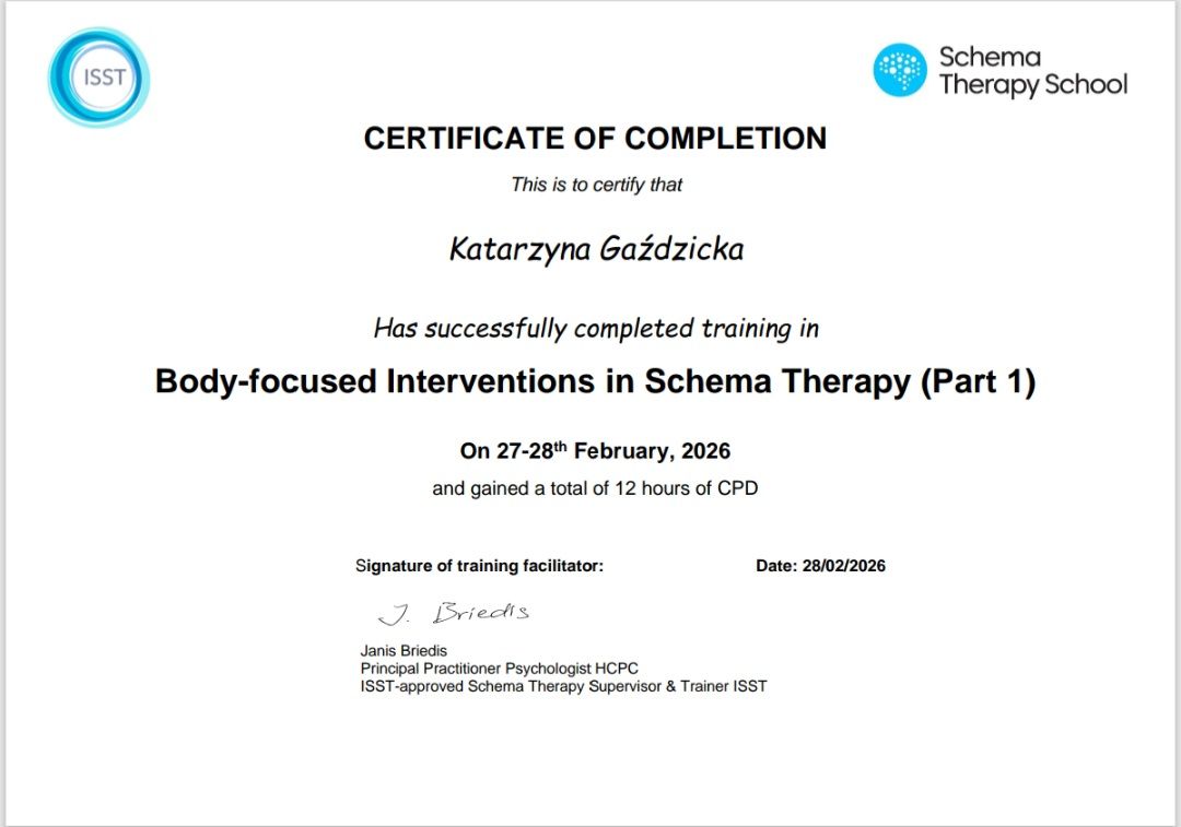 Pani Katarzyna to terapeutka, która nie tylko posiada imponujące kompetencje, ale również autentyczne powołanie do pomagania innym. Widać, że nieustannie się rozwija i wkłada całe serce w swoją pracę. Zdecydowanie polecam każdemu, kto szuka skutecznej, empatycznej i profesjonalnej pomocy