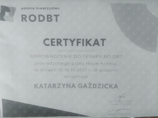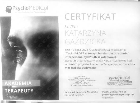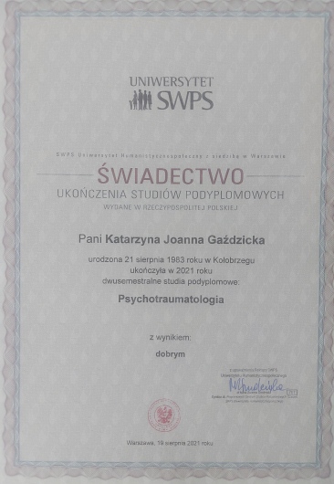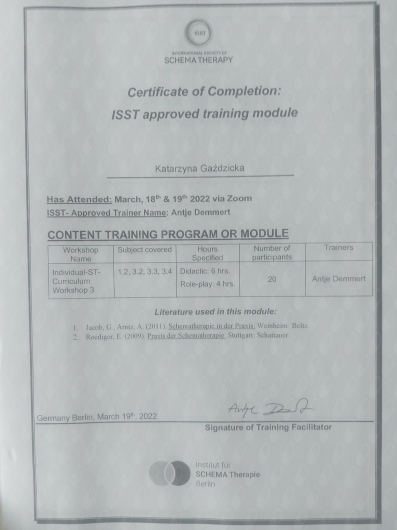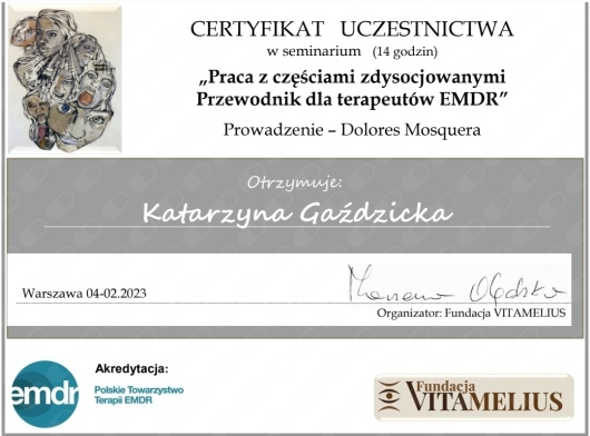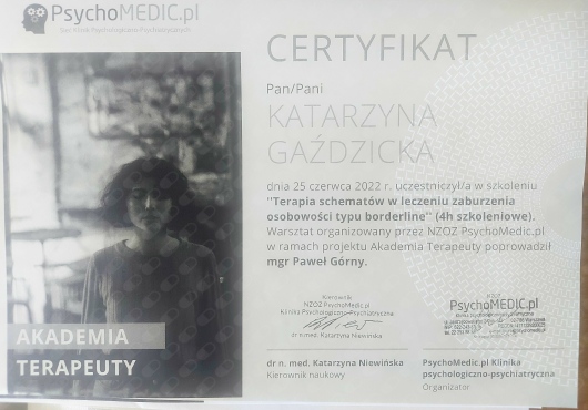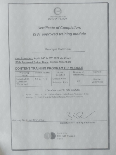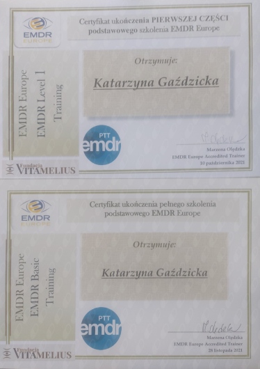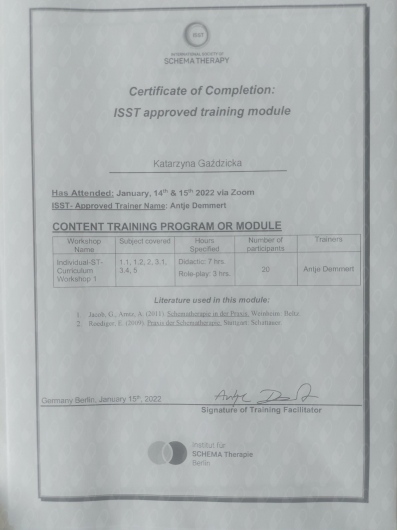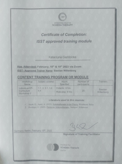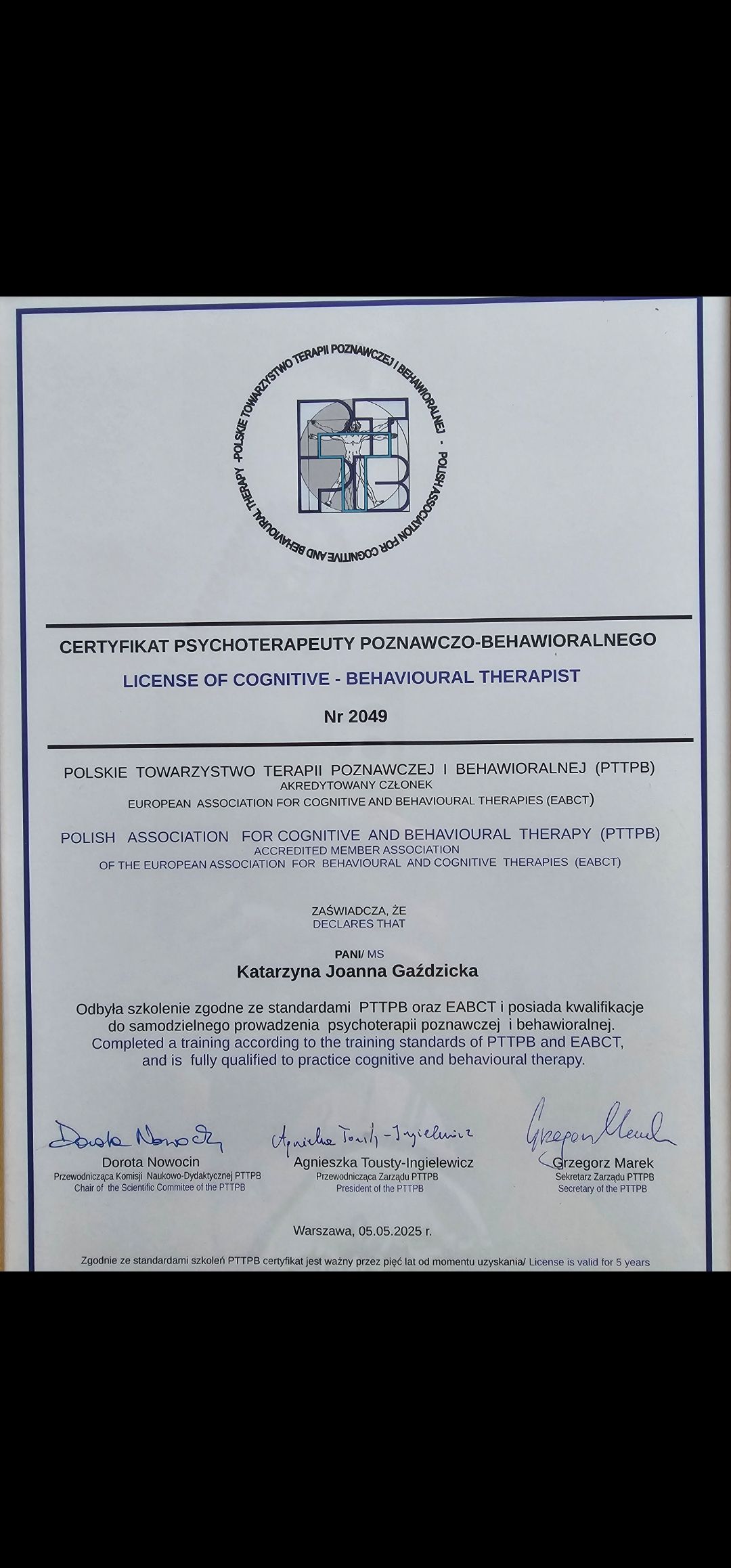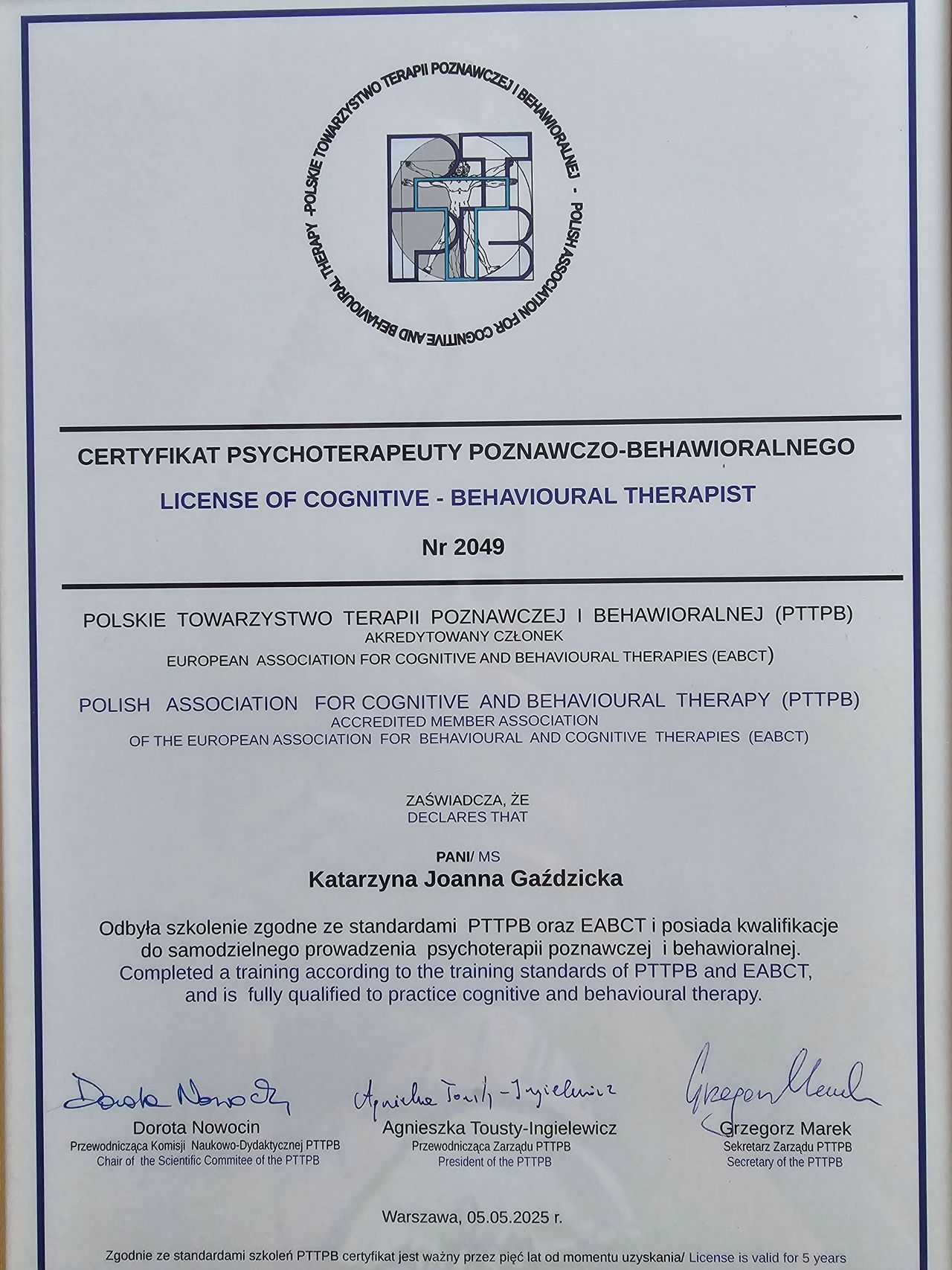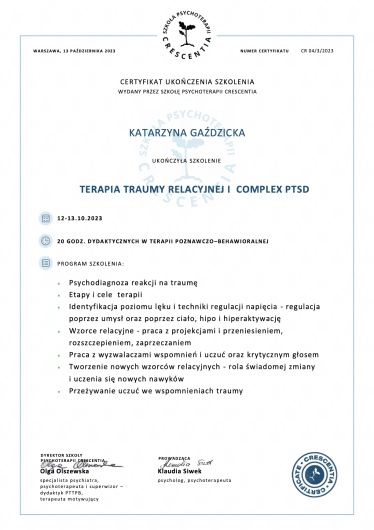 Jestem certyfikowaną psychoterapeutką poznawczo-behawioralną (certyfikat PTTPB nr 2049), psychotraumatolożką i magistrem psychologii. Pracuje w nurcie poznawczo-behawioralnym, terapii schematów, EMDR. Praktykuje również Brainspotting. Pomagam osobom dorosłym, którzy doświadczają w swoim życiu trudności z powodu lęku (napady paniki, nerwica, lęk o zdrowie), bezsenności, spadku nastroju, zaburzeń obsesyjno - kompulsyjnych, niskiej samooceny. Mogę też pomóc osobom cierpiącym z powodu powracających wspomnieć traumatycznych, traumatycznego stresu pourazowego, tj. PTSD oraz C-PTSD ( wypadki, katastrofy, gwałt, pobicie, przemoc domowa , tzw. "trudne dzieciństwo, DDA, molestowanie seksualne, kazirodztwo, zaniedbania w dzieciństwie),czy też mających różnorodne, wywołujące napięcia i konflikty, trudności w relacjach z ludźmi. Swoje doświadczenie w pracy zdobywałam na wielu stażach, m.in. w klinice Psychomedic, Mazowieckim Specjalistyczne Centrum Zdrowia im. prof. Jana Mazurkiewicza w Tworkach, a także współpracując z Centrum Psychoterapii Pokonaj Lęk. Nieustannie podnoszę swoje kwalifikacje uczestnicząc w branżowych konferencjach, szkoleniach, warsztatach, a także regularnie superwizuję się. Jestem członkiem Polskiego Towarzystwa Terapii Poznawczo-Behawioralnej oraz Polskiego Towarzystwa Terapii EMDR.