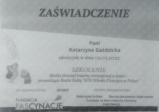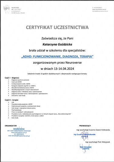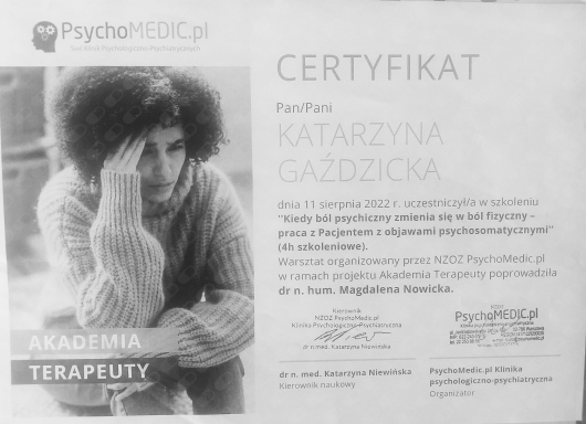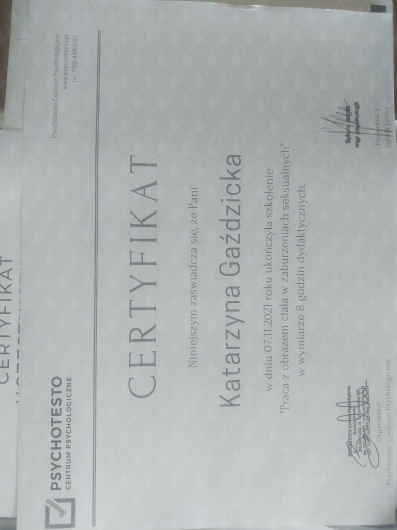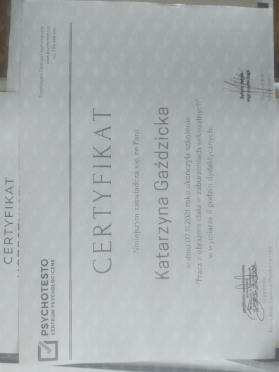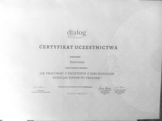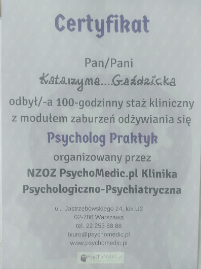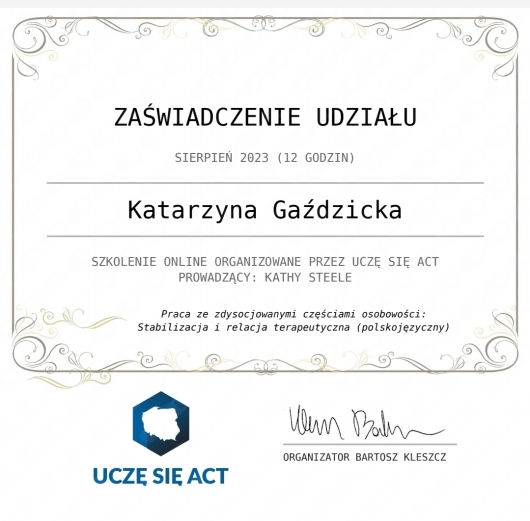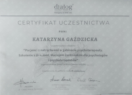 Chcę serdecznie podziękować Pani Katarzynie za wszystkie spotkania terapeutyczne. Dzięki sesjon zyskałam więcej pewności siebie, nie boję się wyzwań. W przypadku trudności, dzięki poznanym narzędziom, potrafię sobie z nimi radzić.