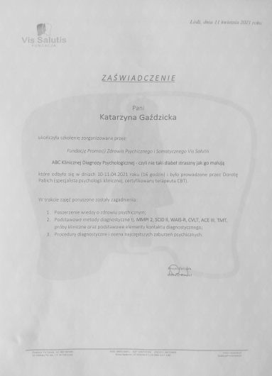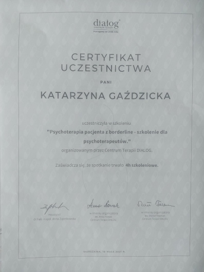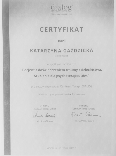 Jestem jeszcze w trakcie terapii, warto jednak podzielić się opinią już teraz. Pani Katarzyna jest specjalistką najwyższej klasy. Zawsze przygotowana do spotkań, empatyczna, otaczająca opieką i zrozumieniem. Z zaangażowaniem podąża za klientem, prowadząc terapię w sposób potwierdzający zrozumienie wyzwań klienta. Podczas sesji tworzy bezpieczną atmosferę, sprzyjającą poruszaniu trudnych tematów. Całą współpracę oceniam bardzo pozytywnie, wiele się o sobie nauczyłam i nadal wiele odkrywam. Polecam Panią Katarzynę każdej osobie!
