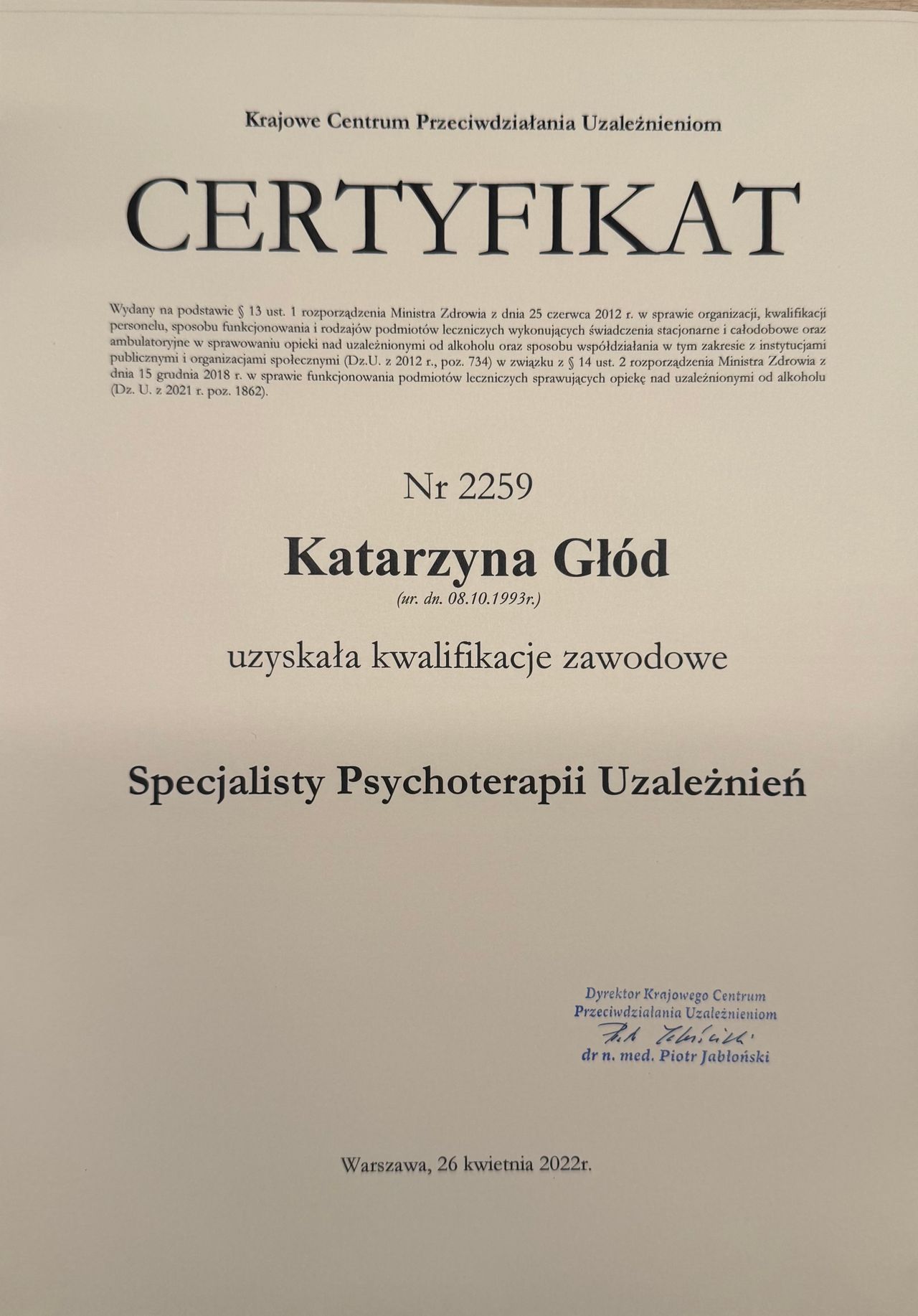 Jestem psychologiem (absolwentką Uniwersytetu Jagiellońskiego), dyplomowaną psychoterapeutką w trakcie procesu certyfikacji oraz certyfikowaną terapeutką uzależnień (numer certyfikatu 2259).