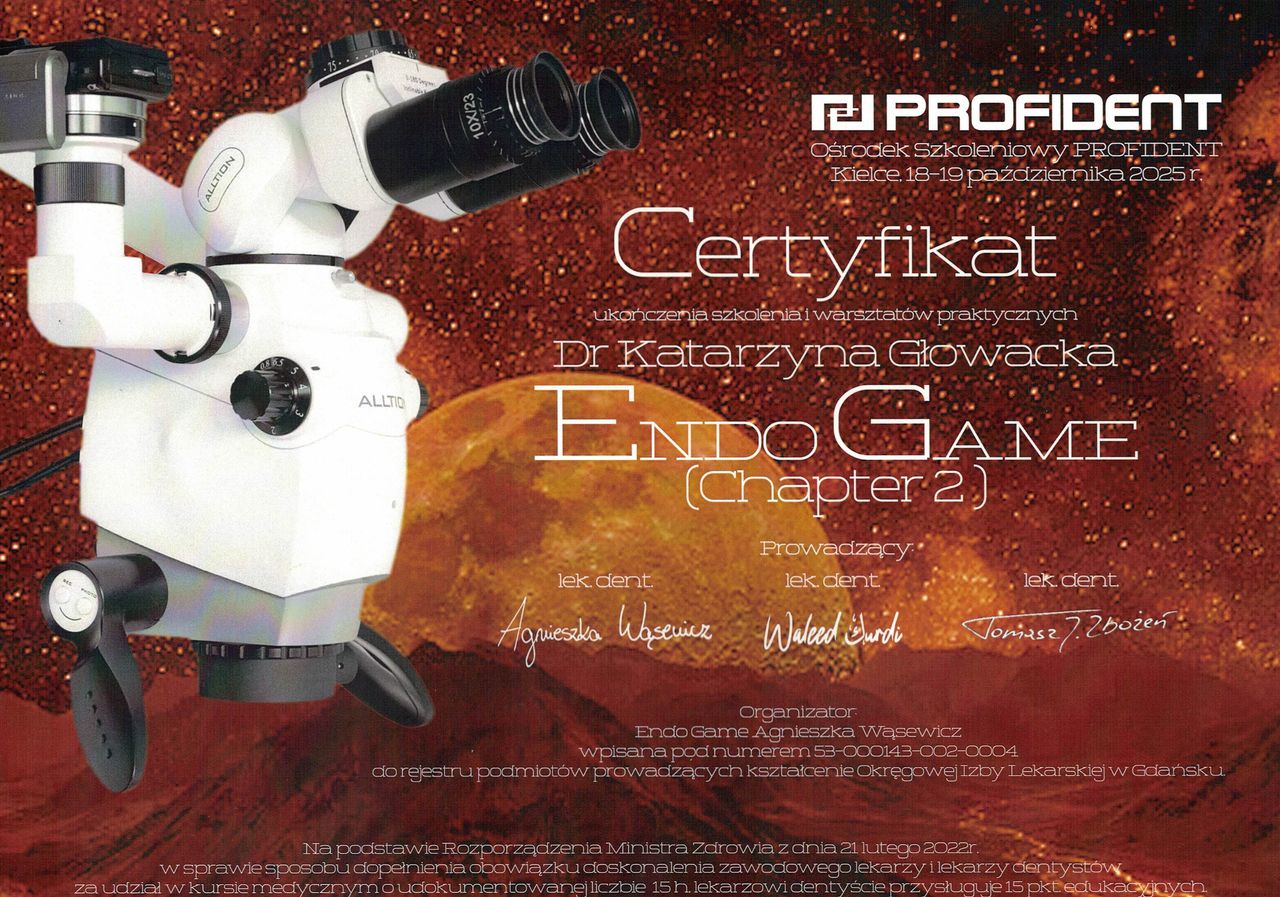 Zajmuję się endodoncją (leczeniem kanałowym pod mikroskopem), protetyką (estetyczne korony, mosty, licówki, protezy szkieletowe, prace kombinowane) i leczeniem zachowawczym.