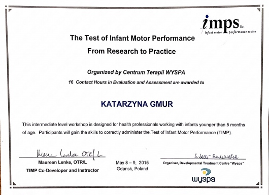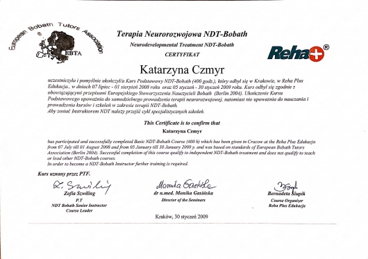 Jestem absolwentką kursów NDT Bobath Basic oraz NDT Bobath Baby, oraz wielu innych szkoleń doskonalących mój warsztat pracy jak i kursów diagnostycznych (TIMP, NBAS Brazelton). Moje całe doświadczenie zawodowe (ponad 14 lat) związane jest z pracą z dziećmi. Swoją drogę zawodową rozpoczęłam w Ośrodku Rehabilitacyjno- Edukacyjno- Wychowawczym gdzie pracowałam z dziećmi z różnymi rodzajami niepełnosprawności, co uważam, w dużym stopniu uksztaltowało mnie jako terapeutę. Moje doświadczenie zawodowe to też praca w ośrodkach wczesnej interwencji oraz stowarzyszeniu na rzecz dzieci niepełnosprawnych. Obecnie pracuje m.in. w Oddziale Intensywnej Terapii Noworodka gdzie każdego dnia uczę się jak jeszcze lepiej wspierać rozwój pacjentów tych najmniejszych.