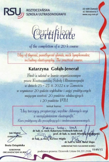 Jaki jest zakres porad oferowanych przez Katarzyna Gołąb-Jenerał?Katarzyna Gołąb-Jenerał to w trakcie specjalizacji (endokrynolog dziecięcy), w trakcie specjalizacji (diabetolog dziecięcy). Na podstawie swojego doświadczenia i wykształcenia Katarzyna Gołąb-Jenerał oferuje usługi takie jak: konsultacja endokrynologa dziecięcego, konsultacja endokrynologa dziecięcego + USG.