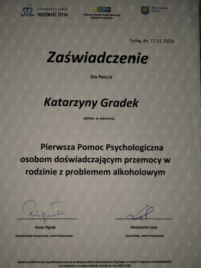 Pani Katarzyna jest miłą i ciepłą osobą .Już na pierwszej wizycie wiedziałam, że trafiłam do właściwego miejsca .Uczę się jak żyć i pogodzić się z tym czego nie mam .