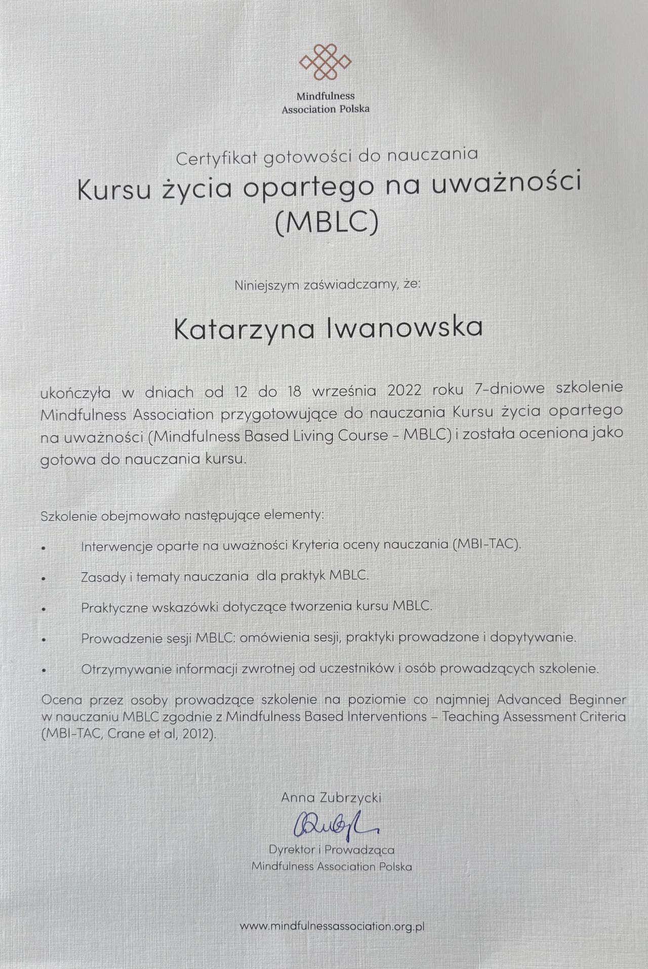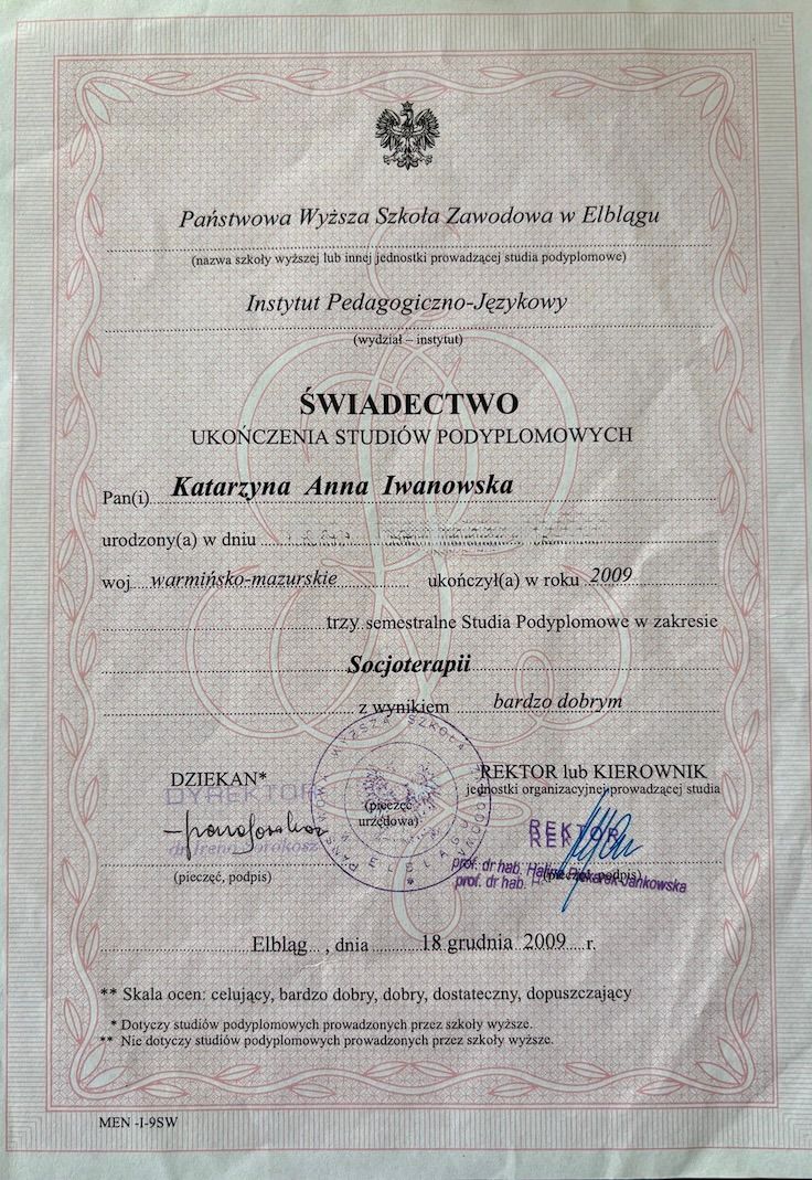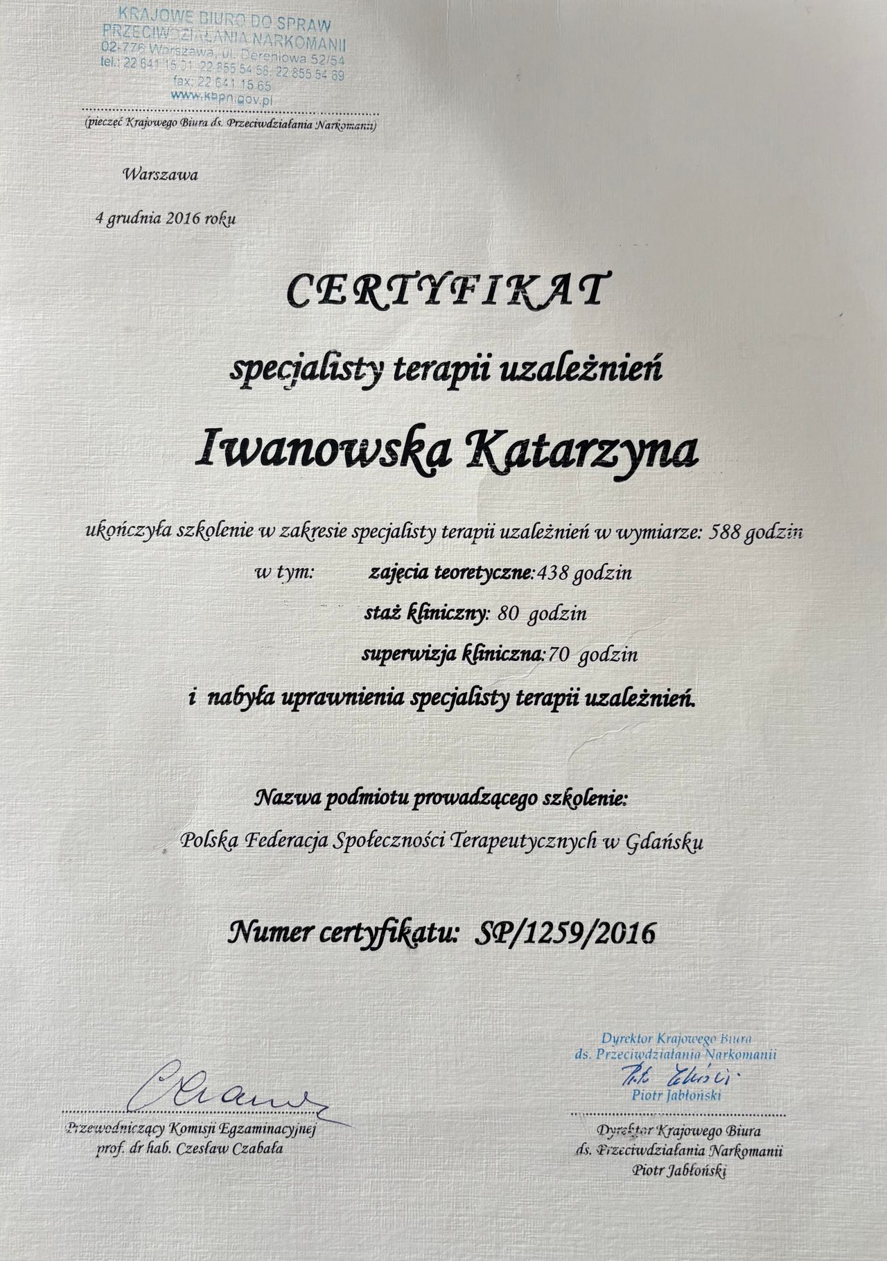 Z wykształcenia jestem psychologiem oraz pedagogiem. Jestem również specjalistą psychoterapii uzależnień (Certyfikat nr SP/1259/2016 wydany przez Krajowe Biuro ds. Przeciwdziałania Narkomanii), socjoterapeutą oraz nauczycielem kursu życia opartego na uważności (MBLC) (Certyfikat wydany przez Mindfulness Association Polska). Aktualnie jestem w trakcie szkolenia, przygotowującego do zdobycia certyfikatu psychoterapeuty integratywnego. Mam ponad 15 lat doświadczenia, ukończyłam szereg szkoleń z zakresu pomocy psychologicznej (m.in. szkolenie I stopnia TSR, terapii motywującej), a swoją pracę poddaję superwizji. Zapraszam do kontaktu :)