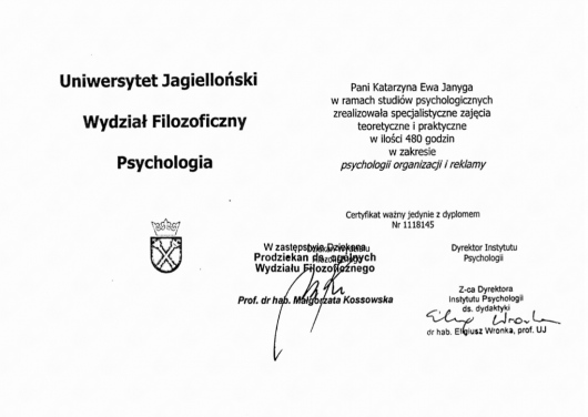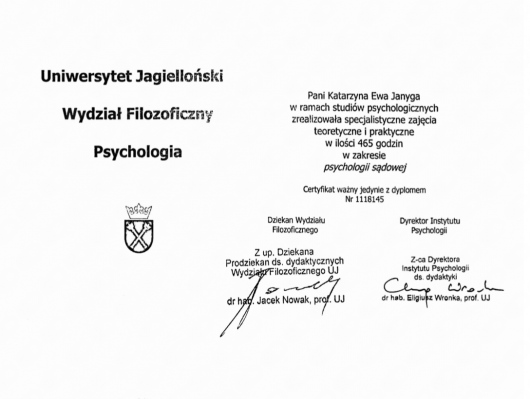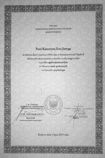 Jestem absolwentką psychologii na Uniwersytecie Jagiellońskim w Krakowie. Pracuje jako terapeutka w Szpitalu Klinicznym im. Józefa Babińskiego - Centrum Zdrowia Psychicznego Małopolska Południe. Ukończyłam Całościowy Kurs przygotowujący do uzyskania Certyfikatu Psychoterapeuty Polskiego Towarzystwa Psychiatrycznego, prowadzony w Katedrze Psychoterapii UJ CM. Jestem również członkinią Polskiego Towarzystwa Psychiatrycznego. Przechodzę przez terapię własną w oraz korzystam z regularnych superwizji u paru superwizorów. Moje doświadczenie zawodowe rozpoczęło się od pracy jako psycholog w szkole podstawowej i szkole średniej, a także odbywania stażu w Zakładzie Karnym. Rozwijałam swoje umiejętności jako stażystka w Katedrze Psychoterapii na Wydziale Psychiatrii Szpitala Uniwersyteckiego Uniwersytetu Jagiellońskiego Collegium Medicum, skupiając się na budowaniu doświadczenia w Szpitalu Klinicznym im. Józefa Babińskiego - Centrum Zdrowia Psychicznego Małopolska Południe. Dodatkowo, doświadczenie budowałam jako wykładowczyni i prowadząc warsztaty z zakresu różnych dziedzin psychologii. Zapraszam do skorzystania z moich usług terapeutycznych DLA DOROSŁYCH, dostępnych także w formie kontaktu online.