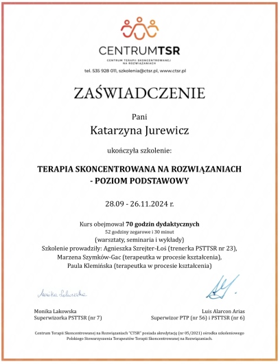 Czy Katarzyna Jurewicz przyjmuje online, bez konieczności pojawiania się w placówce?Tak, Katarzyna Jurewicz oferuje konsultacje online. Wybierz opcję „konsultacja online” przy umawianiu wizyty, a zobaczysz dostępne terminy.