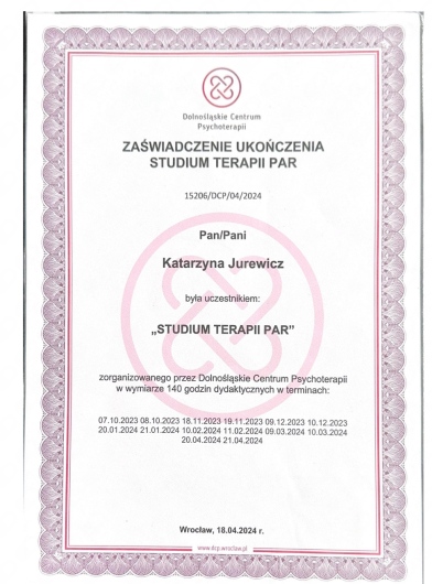 Jestem psychologiem, seksuologiem i terapeutą par i małżeństw. Ukończyłam psychologię na Uniwersytecie Łódzkim ze specjalnością “psychologia kliniczna i zdrowia”. Studia podyplomowe z zakresu seksuologii klinicznej ukończyłam w Akademii Ekonomiczno-Humanistycznej w Warszawie. Posiadam także certyfikat studiów podyplomowych z przygotowania pedagogicznego dla psychologów Wyższej Szkoły Nauk o Zdrowiu w Bydgoszczy. Ukończyłam roczne szkolenie z zakresu terapii par i małżeństw w Dolnośląskim Centrum Psychoterapii we Wrocławiu. W Centrum Terapii Skoncentrowanej na Rozwiązaniach CTSR ukończyłam poziom podstawowy szkolenia Terapii Skoncentrowanej na Rozwiązaniach. Staram się stale poszerzać swoją wiedzę poprzez udział w szkoleniach i webinarich, np. z leczenia ataków paniki. Pomagam osobom dorosłym i parom potrzebującym wsparcia w problemach natury emocjonalnej i seksuologicznej. Najważniejsze w mojej pracy jest dla mnie dobro Pacjenta, jego komfort i poczucie bezpieczeństwa w relacji terapeutycznej. Zapraszam również osoby ze społeczności LGBTQ+.