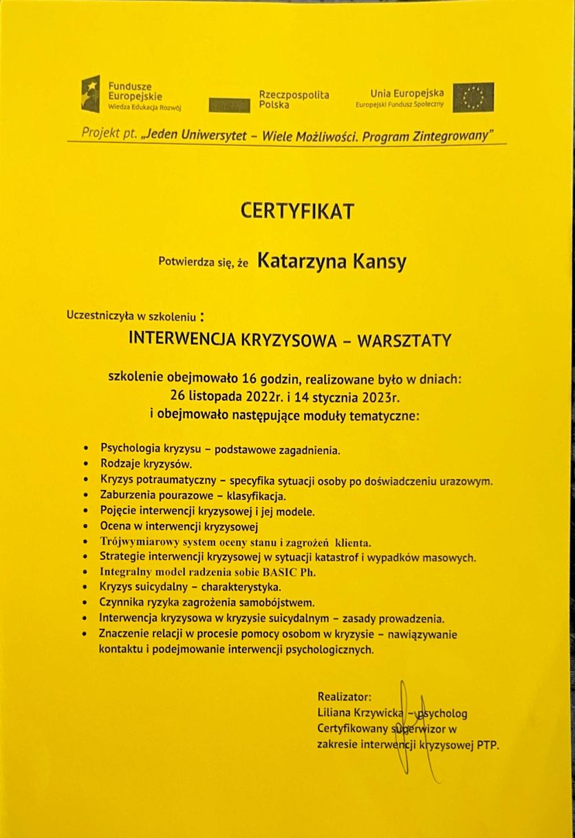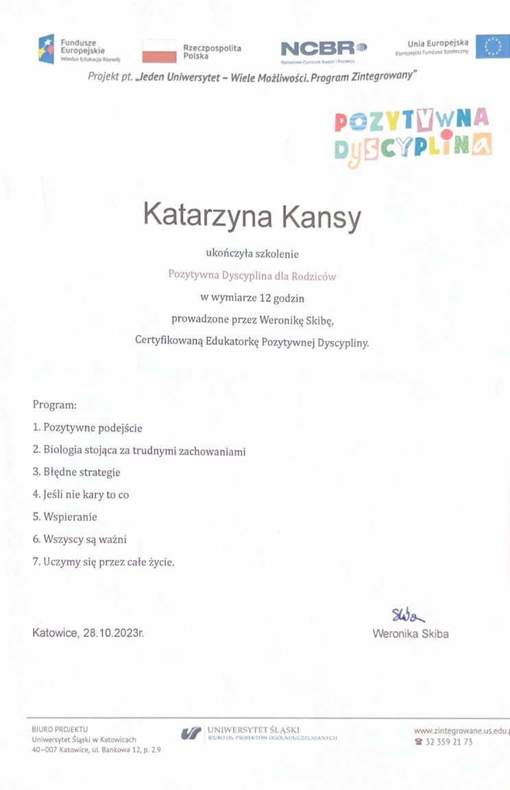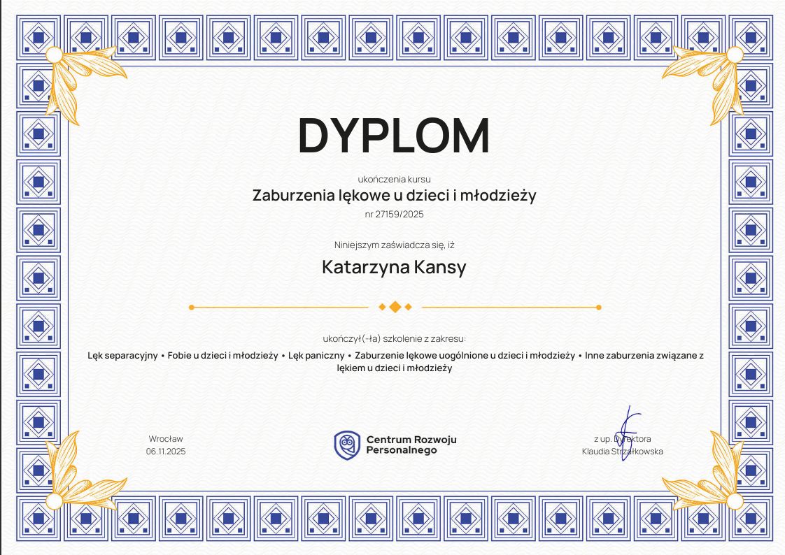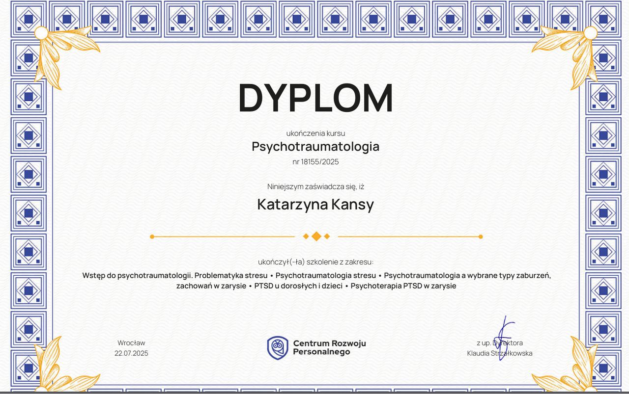 Ukończyłam studia magisterskie z psychologii na Uniwersytecie Śląskim w Katowicach. Obecnie kształcę się na studiach podyplomowych z zakresu seksuologii klinicznej oraz nieustannie poszerzam swoją wiedzę, uczestnicząc w licznych szkoleniach, m.in. z pozytywnej dyscypliny, psychotraumatologii i interwencji kryzysowej. Jestem również w trakcie procesu certyfikacji jako trener Treningu Umiejętności Społecznych (TUS) oraz Treningu Kontrolowania Złości.